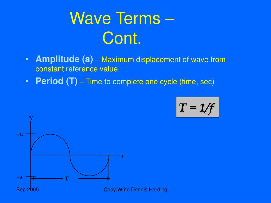 Wave Terms – Cont. • Amplitude (a) – Maximum displacement of wave from constant reference value. • Period (T) – Time to complete one cycle (time, sec) T = 1/f Copy Write Dennis Harding
