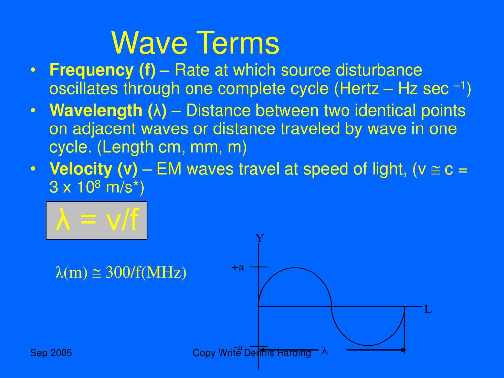 Wave Terms • Frequency (f) – Rate at which source disturbance oscillates through one complete cycle (Hertz – Hz sec –1) • Wavelength (λ) – Distance between two identical points on adjacent waves or distance traveled by wave in one cycle. (Length cm, mm, m) • Velocity (v) – EM waves travel at speed of light, (v c = 3 x 108 m/s*) λ = v/f λ(m) 300/f(MHz) Copy Write Dennis Harding
