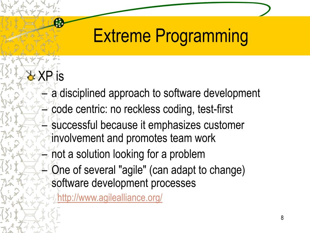 Extreme Programming • XP is • a disciplined approach to software development • code centric: no reckless coding, test-first • successful because it emphasizes customer involvement and promotes team work • not a solution looking for a problem • One of several "agile" (can adapt to change) software development processes http://www.agilealliance.org/