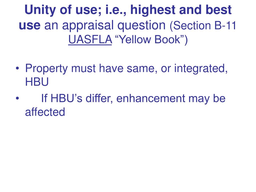 Unity of use;i.e., highest and best use an appraisal question (Section B-11 UASFLA “Yellow Book”) • Property must have same, or integrated, HBU • If HBU’s differ, enhancement may be affected