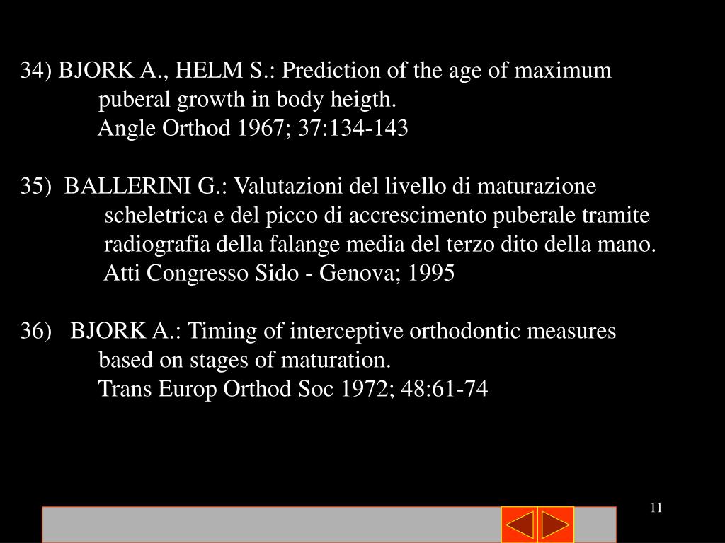 34) BJORK A., HELM S.: Prediction of the age of maximum puberal growth in body heigth. Angle Orthod 1967; 37:134-143 35) BALLERINI G.: Valutazioni del livello di maturazione scheletrica e del picco di accrescimento puberale tramite radiografia della falange media del terzo dito della mano. Atti Congresso Sido - Genova; 1995 36) BJORK A.: Timing of interceptive orthodontic measures based on stages of maturation. Trans Europ Orthod Soc 1972; 48:61-74