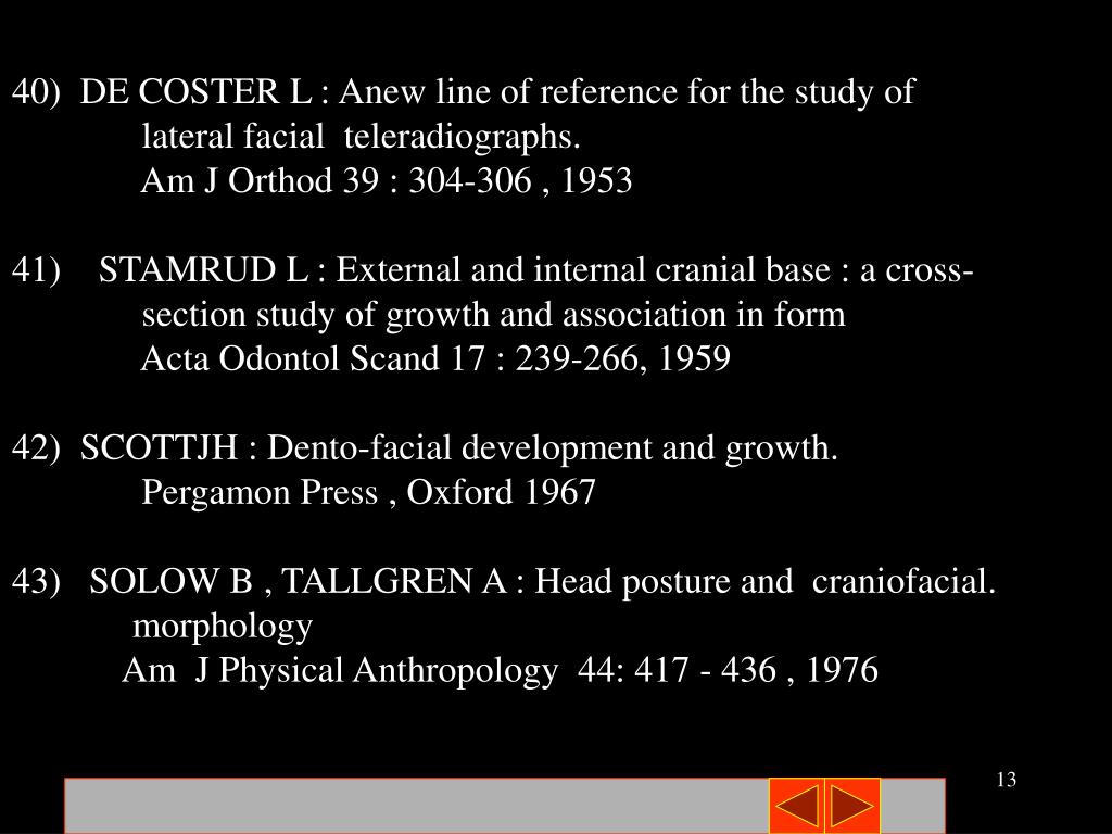 40) DE COSTER L : Anew line of reference for the study of lateral facial teleradiographs. Am J Orthod 39 : 304-306 , 1953 41) STAMRUD L : External and internal cranial base : a cross- section study of growth and association in form Acta Odontol Scand 17 : 239-266, 1959 42) SCOTTJH : Dento-facial development and growth. Pergamon Press , Oxford 1967 43) SOLOW B , TALLGREN A : Head posture and craniofacial. morphology Am J Physical Anthropology 44: 417 - 436 , 1976