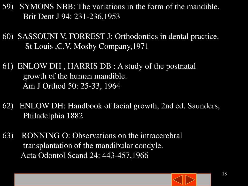 59) SYMONS NBB: The variations in the form of the mandible. Brit Dent J 94: 231-236,1953 60) SASSOUNI V, FORREST J: Orthodontics in dental practice. St Louis ,C.V. Mosby Company,1971 61) ENLOW DH , HARRIS DB : A study of the postnatal growth of the human mandible. Am J Orthod 50: 25-33, 1964 62) ENLOW DH: Handbook of facial growth, 2nd ed. Saunders, Philadelphia 1882 63) RONNING O: Observations on the intracerebral transplantation of the mandibular condyle. Acta Odontol Scand 24: 443-457,1966