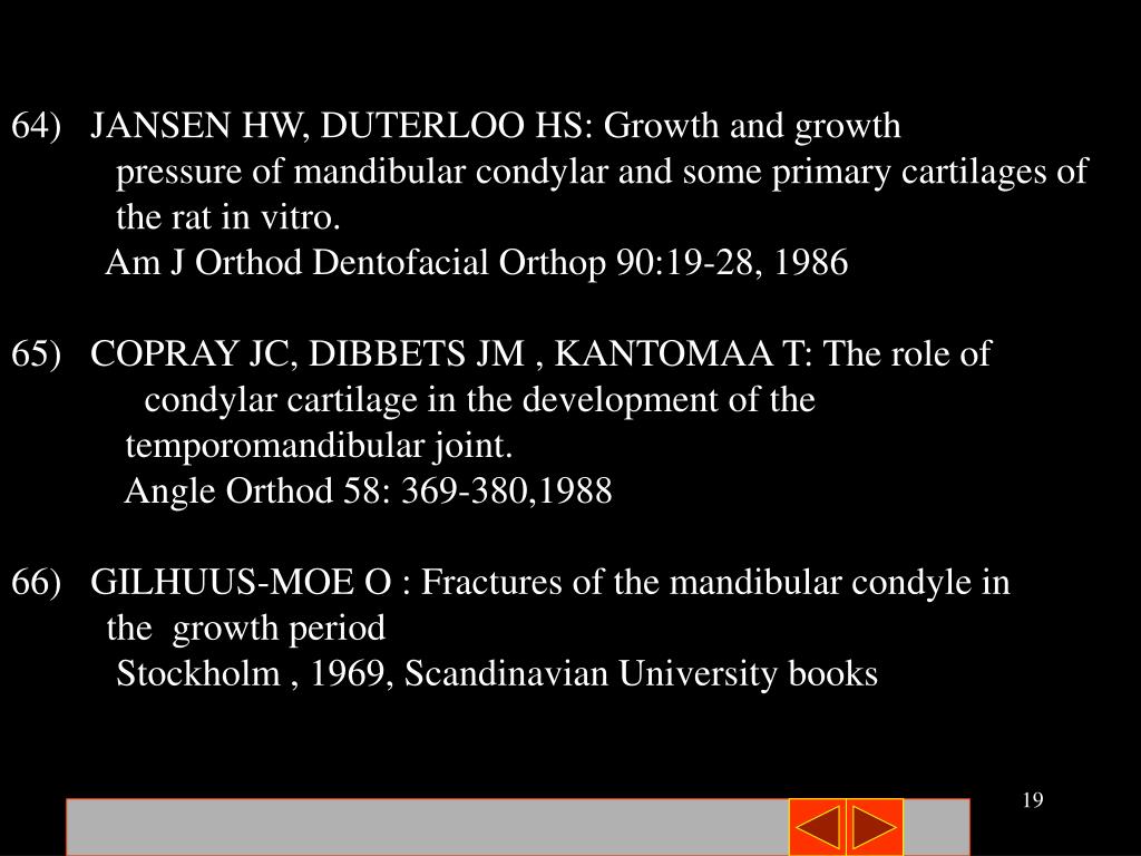 64) JANSEN HW, DUTERLOO HS: Growth and growth pressure of mandibular condylar and some primary cartilages of the rat in vitro. Am J Orthod Dentofacial Orthop 90:19-28, 1986 65) COPRAY JC, DIBBETS JM , KANTOMAA T: The role of condylar cartilage in the development of the temporomandibular joint. Angle Orthod 58: 369-380,1988 66) GILHUUS-MOE O : Fractures of the mandibular condyle in the growth period Stockholm , 1969, Scandinavian University books