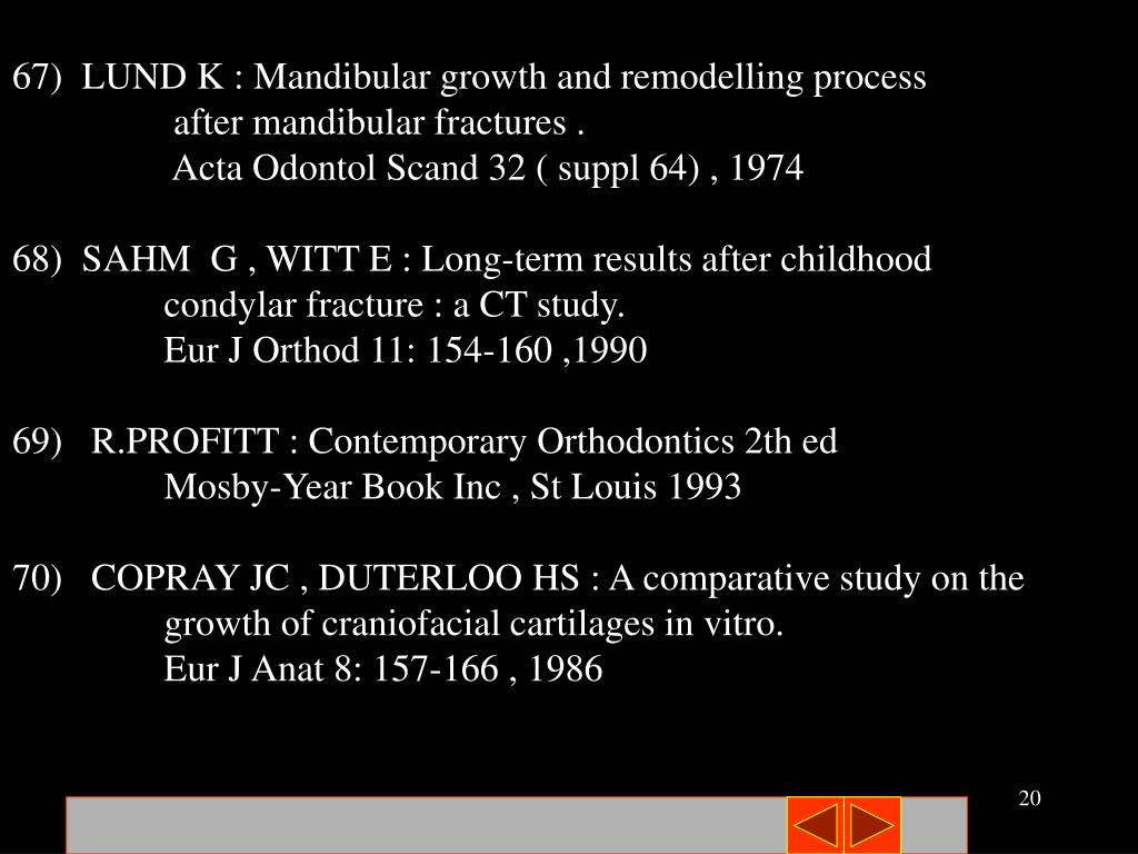 67) LUND K : Mandibular growth and remodelling process after mandibular fractures . Acta Odontol Scand 32 ( suppl 64) , 1974 68) SAHM G , WITT E : Long-term results after childhood condylar fracture : a CT study. Eur J Orthod 11: 154-160 ,1990 69) R.PROFITT : Contemporary Orthodontics 2th ed Mosby-Year Book Inc , St Louis 1993 70) COPRAY JC , DUTERLOO HS : A comparative study on the growth of craniofacial cartilages in vitro. Eur J Anat 8: 157-166 , 1986