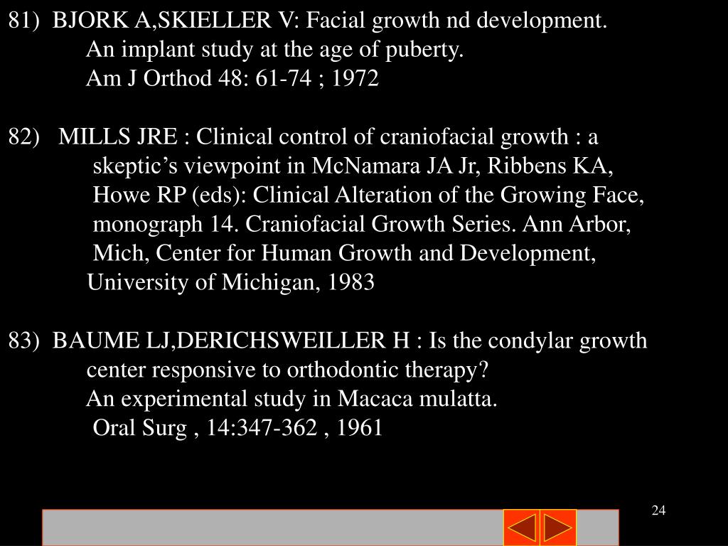 81) BJORK A,SKIELLER V: Facial growth nd development. An implant study at the age of puberty. Am J Orthod 48: 61-74 ; 1972 82) MILLS JRE : Clinical control of craniofacial growth : a skeptic’s viewpoint in McNamara JA Jr, Ribbens KA, Howe RP (eds): Clinical Alteration of the Growing Face, monograph 14. Craniofacial Growth Series. Ann Arbor, Mich, Center for Human Growth and Development, University of Michigan, 1983 83) BAUME LJ,DERICHSWEILLER H : Is the condylar growth center responsive to orthodontic therapy? An experimental study in Macaca mulatta. Oral Surg , 14:347-362 , 1961