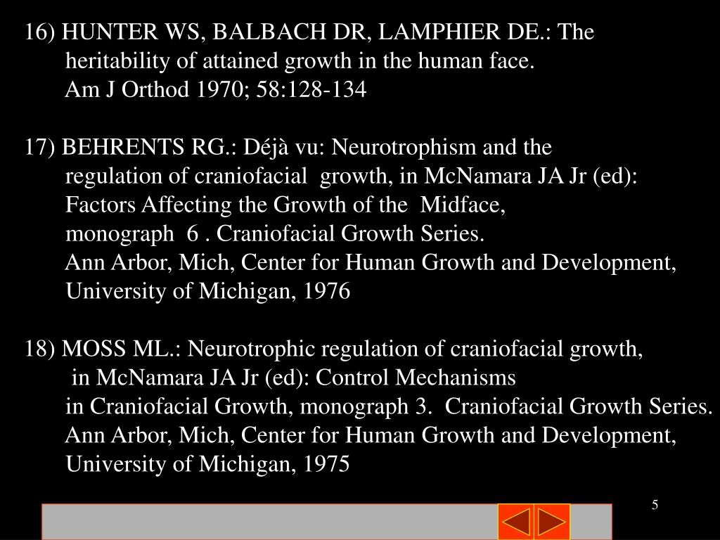 16) HUNTER WS, BALBACH DR, LAMPHIER DE.: The heritability of attained growth in the human face. Am J Orthod 1970; 58:128-134 17) BEHRENTS RG.: Déjà vu: Neurotrophism and the regulation of craniofacial growth, in McNamara JA Jr (ed): Factors Affecting the Growth of the Midface, monograph 6 . Craniofacial Growth Series. Ann Arbor, Mich, Center for Human Growth and Development, University of Michigan, 1976 18) MOSS ML.: Neurotrophic regulation of craniofacial growth, in McNamara JA Jr (ed): Control Mechanisms in Craniofacial Growth, monograph 3. Craniofacial Growth Series. Ann Arbor, Mich, Center for Human Growth and Development, University of Michigan, 1975