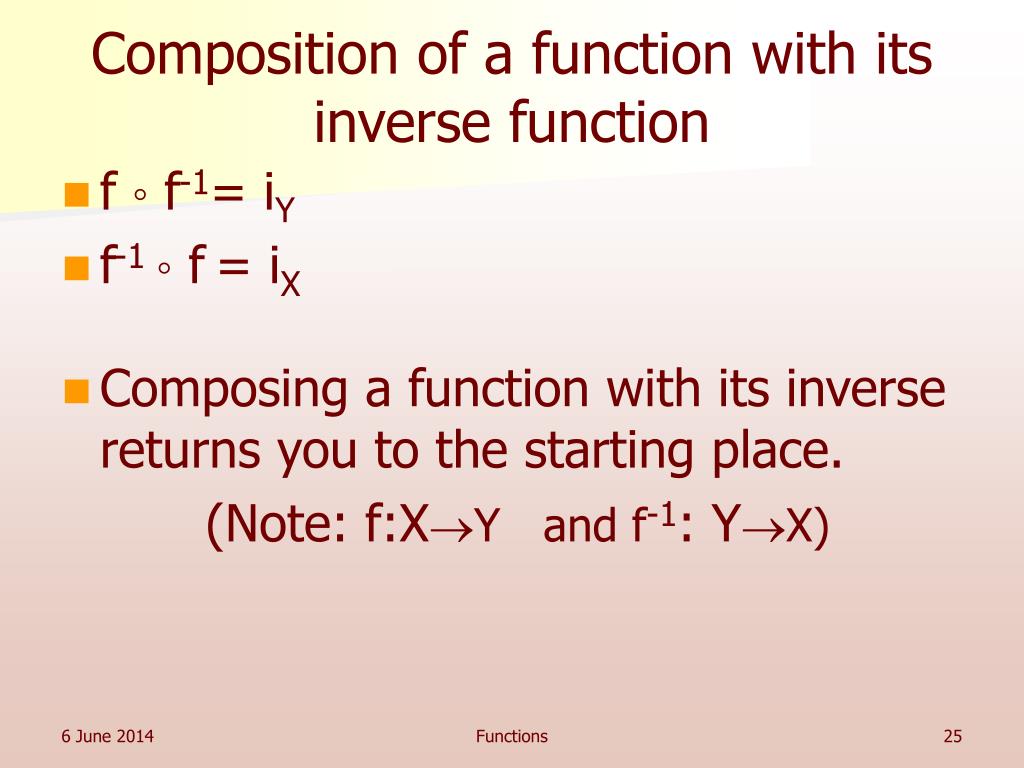 Composition of a function with its inverse function • f ◦ f-1= iY • f-1 ◦f= iX • Composing a function with its inverse returns you to the starting place. (Note: f:XY and f-1: YX) Functions