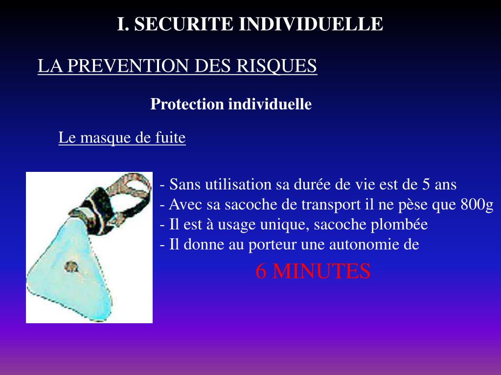 I. SECURITE INDIVIDUELLE LA PREVENTION DES RISQUES Protection individuelle Le masque de fuite - Sans utilisation sa durée de vie est de 5 ans - Avec sa sacoche de transport il ne pèse que 800g - Il est à usage unique, sacoche plombée - Il donne au porteur une autonomie de 6 MINUTES