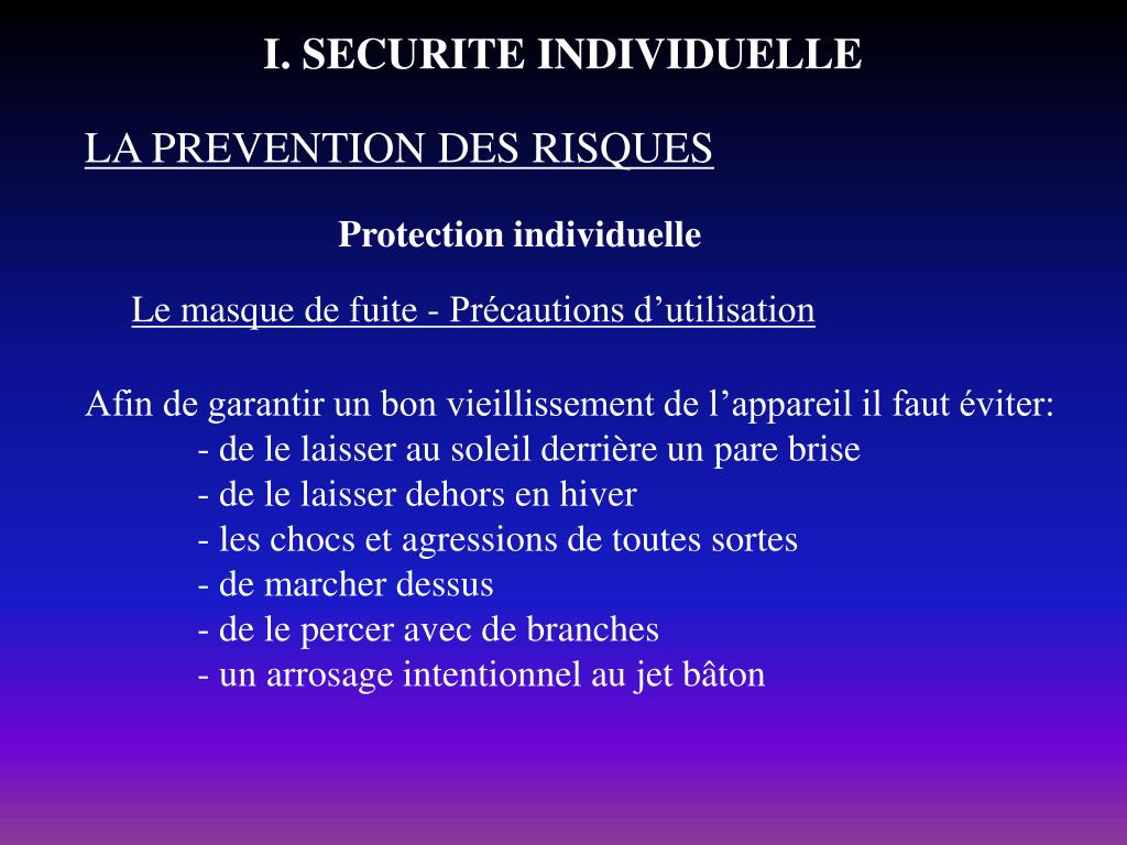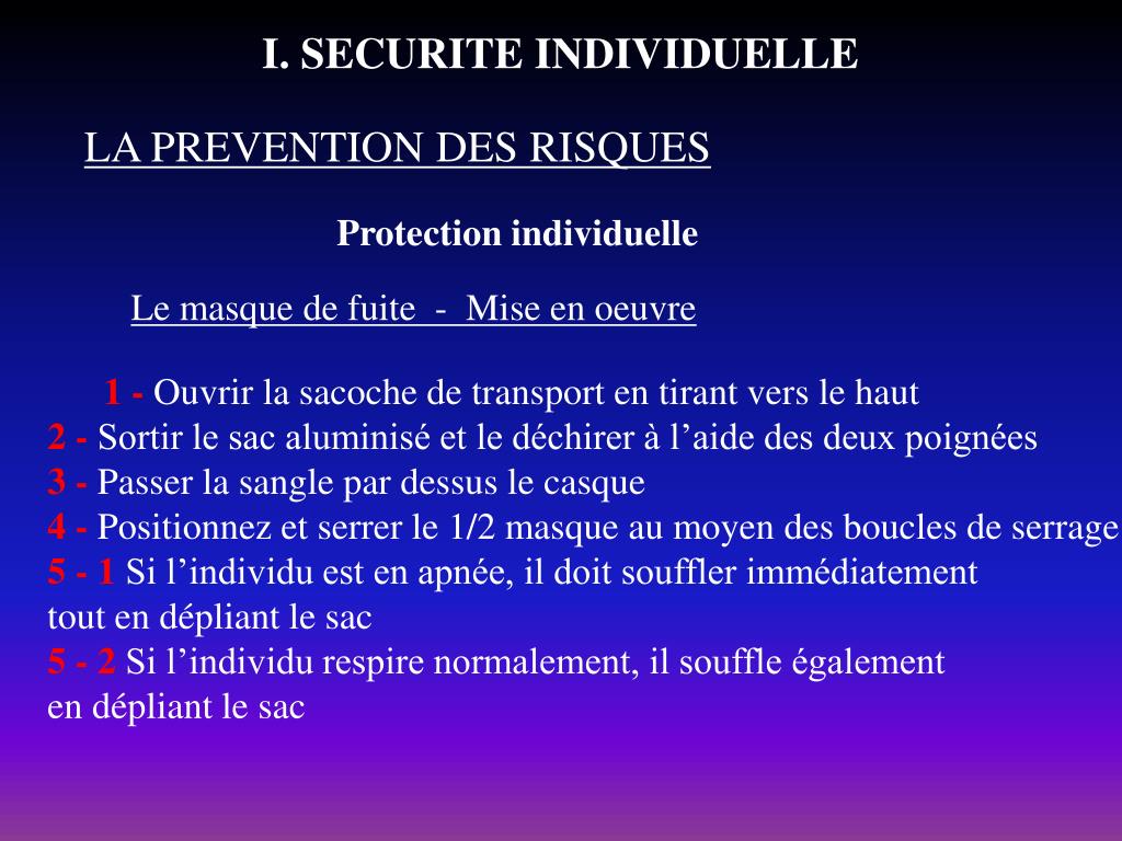 I. SECURITE INDIVIDUELLE LA PREVENTION DES RISQUES Protection individuelle Le masque de fuite On doit le porter constamment en opération car il peut servir à tout moment