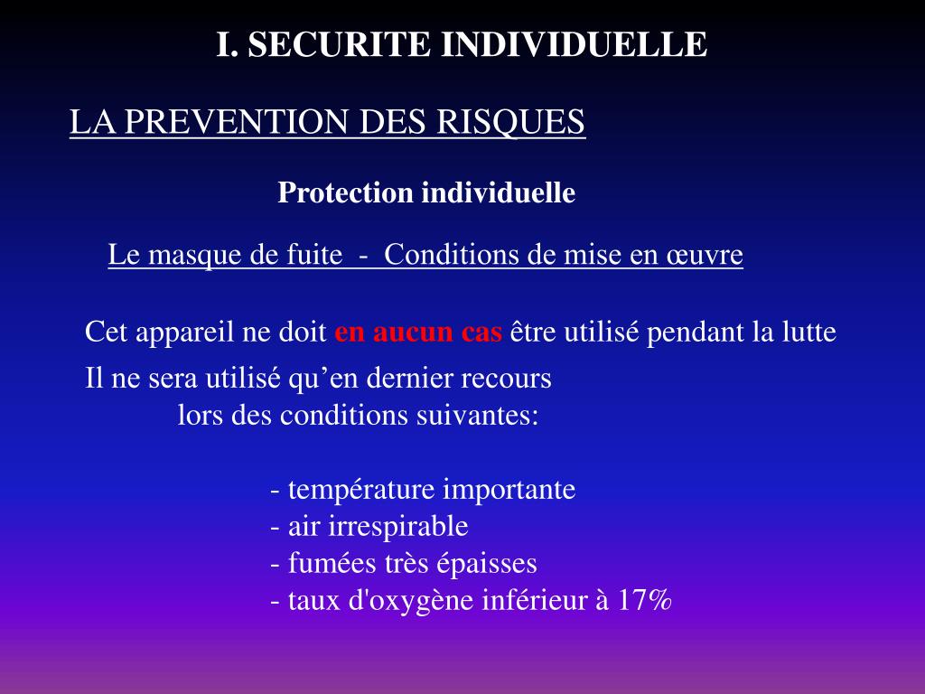 I. SECURITE INDIVIDUELLE LA PREVENTION DES RISQUES Protection individuelle Le masque de fuite - Conditions de mise en œuvre Cet appareil ne doit en aucun cas être utilisé pendant la lutte Il ne sera utilisé qu’en dernier recours lors des conditions suivantes: - température importante - air irrespirable - fumées très épaisses - taux d'oxygène inférieur à 17%
