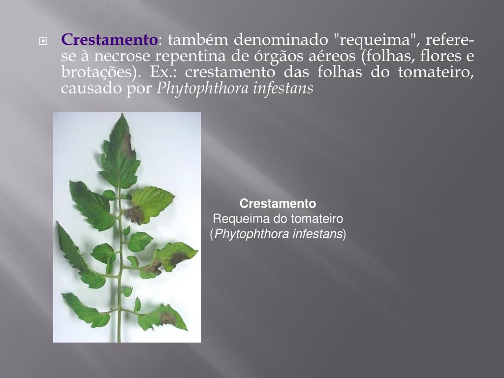 Crestamento: também denominado "requeima", refere-se à necrose repentina de órgãos aéreos (folhas, flores e brotações). Ex.: crestamento das folhas do tomateiro, causado por Phytophthorainfestans CrestamentoRequeima do tomateiro (Phytophthora infestans)