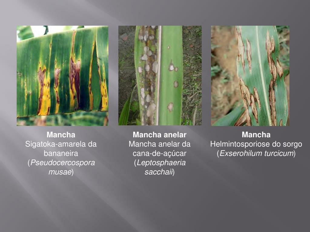 ManchaSigatoka-amarela da bananeira (Pseudocercospora musae) Mancha anelarMancha anelar da cana-de-açúcar (Leptosphaeria sacchaii) ManchaHelmintosporiose do sorgo (Exserohilum turcicum)