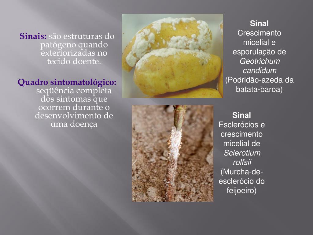 SinalCrescimento micelial e esporulação de Geotrichum candidum(Podridão-azeda da batata-baroa) Sinais:são estruturas do patógeno quando exteriorizadas no tecido doente. Quadro sintomatológico: seqüência completa dos sintomas que ocorrem durante o desenvolvimento de uma doença SinalEsclerócios e crescimento micelial de Sclerotium rolfsii(Murcha-de-esclerócio do feijoeiro)