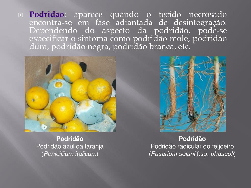Podridão: aparece quando o tecido necrosado encontra-se em fase adiantada de desintegração. Dependendo do aspecto da podridão, pode-se especificar o sintoma como podridão mole, podridão dura, podridão negra, podridão branca, etc. PodridãoPodridão azul da laranja (Penicillium italicum) PodridãoPodridão radicular do feijoeiro (Fusarium solani f.sp. phaseoli)