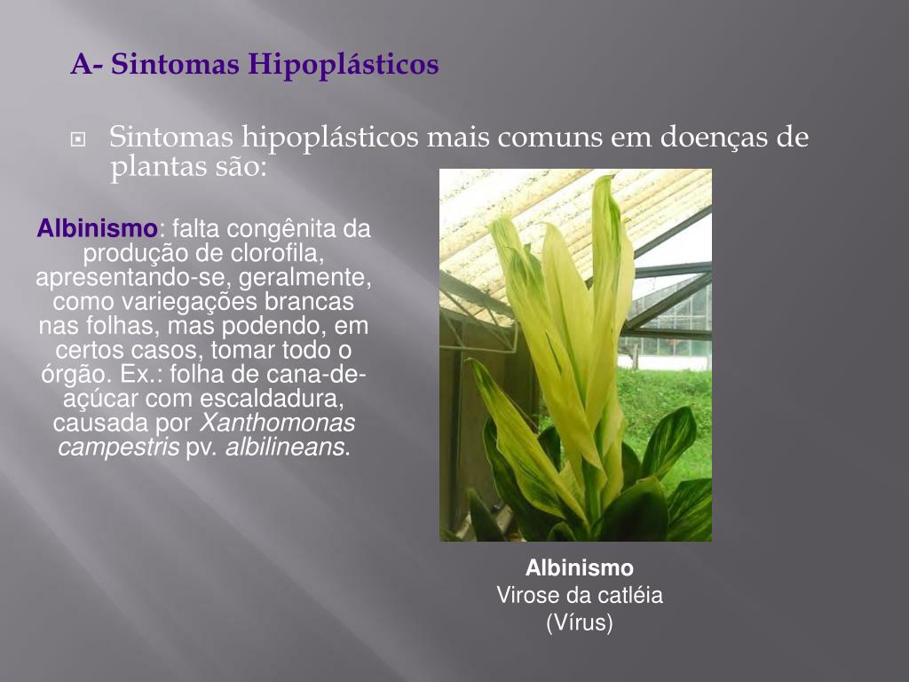 A- Sintomas Hipoplásticos • Sintomas hipoplásticos mais comuns em doenças de plantas são: Albinismo: falta congênita da produção de clorofila, apresentando-se, geralmente, como variegações brancas nas folhas, mas podendo, em certos casos, tomar todo o órgão. Ex.: folha de cana-de-açúcar com escaldadura, causada por Xanthomonas campestris pv. albilineans. AlbinismoVirose da catléia (Vírus)