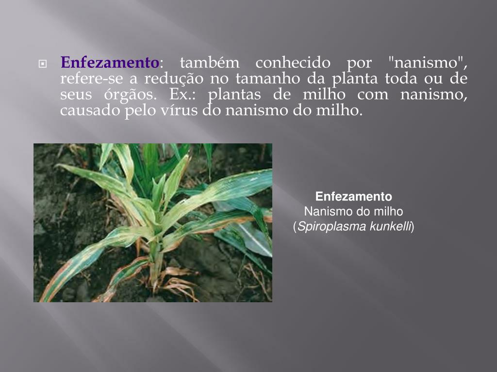 Enfezamento: também conhecido por "nanismo", refere-se a redução no tamanho da planta toda ou de seus órgãos. Ex.: plantas de milho com nanismo, causado pelo vírus do nanismo do milho. EnfezamentoNanismo do milho (Spiroplasma kunkelli)