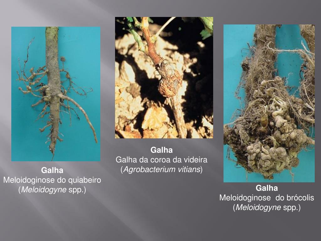 GalhaGalha da coroa da videira (Agrobacterium vitians) GalhaMeloidoginose do quiabeiro (Meloidogyne spp.) GalhaMeloidoginose do brócolis (Meloidogyne spp.)