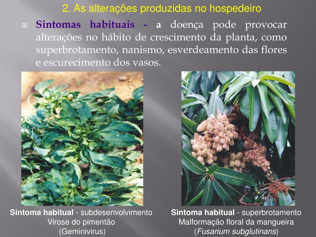 2. As alterações produzidas no hospedeiro • Sintomas habituais - a doença pode provocar alterações no hábito de crescimento da planta, como superbrotamento, nanismo, esverdeamento das flores e escurecimento dos vasos. Sintoma habitual - subdesenvolvimento Virose do pimentão (Geminivirus) Sintoma habitual - superbrotamento Malformação floral da mangueira (Fusarium subglutinans)