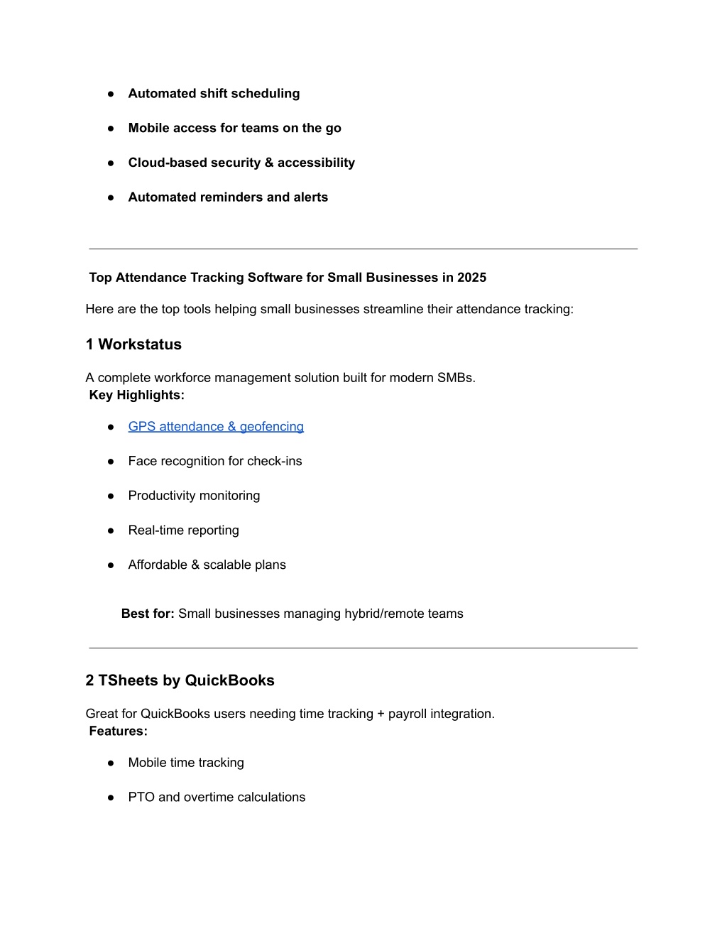 ● Automated shift scheduling ● Mobile access for teams on the go ● Cloud-based security & accessibility ● Automated reminders and alerts Top Attendance Tracking Software for Small Businesses in 2025 Here are the top tools helping small businesses streamline their attendance tracking: 1 Workstatus A complete workforce management solution built for modern SMBs. Key Highlights: ● GPS attendance & geofencing ● Face recognition for check-ins ● Productivity monitoring ● Real-time reporting ● Affordable & scalable plans Best for: Small businesses managing hybrid/remote teams 2 TSheets by QuickBooks Great for QuickBooks users needing time tracking + payroll integration. Features: ● Mobile time tracking ● PTO and overtime calculations