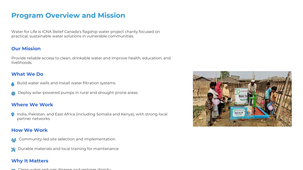 2. Program Overview and Mission Water for Life is ICNA Relief Canada's flagship water project charity focused on practical, sustainable water solutions in vulnerable communities. Our Mission Provide reliable access to clean, drinkable water and improve health, education, and livelihoods. What We Do Build water wells and install water filtration systems Deploy solar-powered pumps in rural and drought-prone areas Where We Work India, Pakistan, and East Africa (including Somalia and Kenya), with strong local partner networks How We Work Community-led site selection and implementation Durable materials and local training for maintenance Why It Matters Clean water reduces disease and restores dignity Time saved means more opportunity for education and income