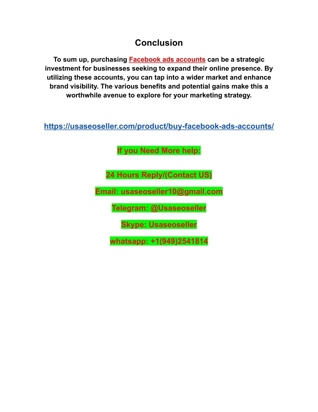 Conclusion To sum up, purchasing Facebook ads accounts can be a strategic investment for businesses seeking to expand their online presence. By utilizing these accounts, you can tap into a wider market and enhance brand visibility. The various benefits and potential gains make this a worthwhile avenue to explore for your marketing strategy. https://usaseoseller.com/product/buy-facebook-ads-accounts/ If you Need More help: 24 Hours Reply/(Contact US) Email: usaseoseller10@gmail.com Telegram: @Usaseoseller Skype: Usaseoseller whatsapp: +1(949)2541814
