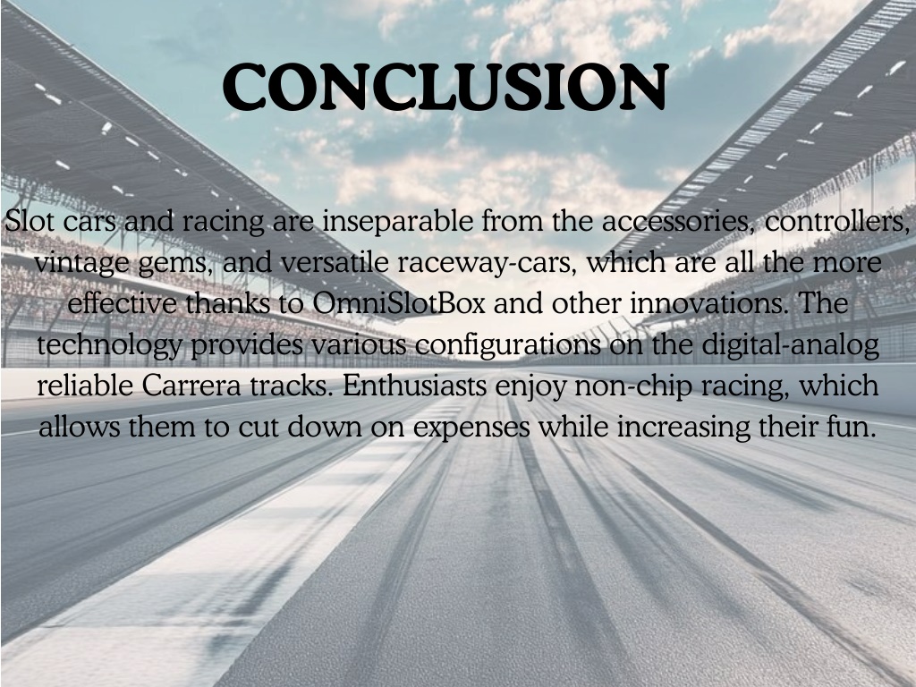 CONCLUSION Slot cars and racing are inseparable from the accessories, controllers, vintage gems, and versatile raceway-cars, which are all the more effective thanks to OmniSlotBox and other innovations. The technology provides various configurations on the digital-analog reliable Carrera tracks. Enthusiasts enjoy non-chip racing, which allows them to cut down on expenses while increasing their fun.