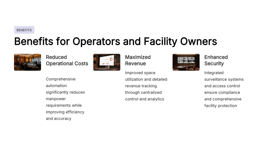 BENEFITS Benefits for Operators and Facility Owners Reduced Operational Costs Maximized Revenue Enhanced Security Improved space utilization and detailed revenue tracking through centralized control and analytics Integrated surveillance systems and access control ensure compliance and comprehensive facility protection Comprehensive automation significantly reduces manpower requirements while improving efficiency and accuracy