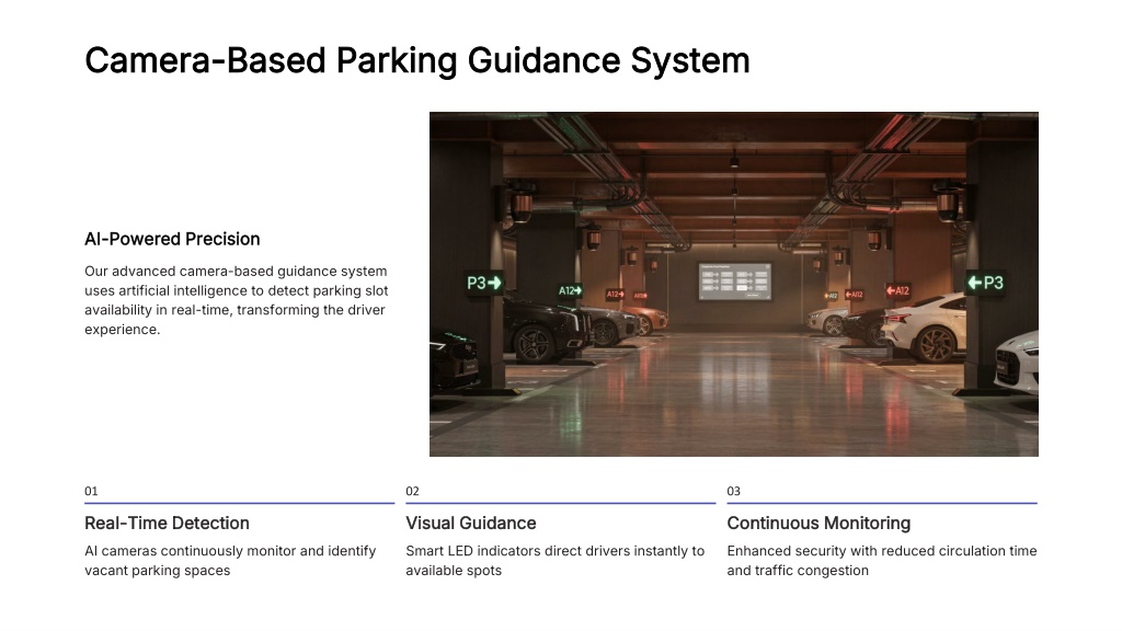 Camera-Based Parking Guidance System AI-Powered Precision Our advanced camera-based guidance system uses artificial intelligence to detect parking slot availability in real-time, transforming the driver experience. 01 02 03 Real-Time Detection Visual Guidance Continuous Monitoring AI cameras continuously monitor and identify vacant parking spaces Smart LED indicators direct drivers instantly to available spots Enhanced security with reduced circulation time and traffic congestion