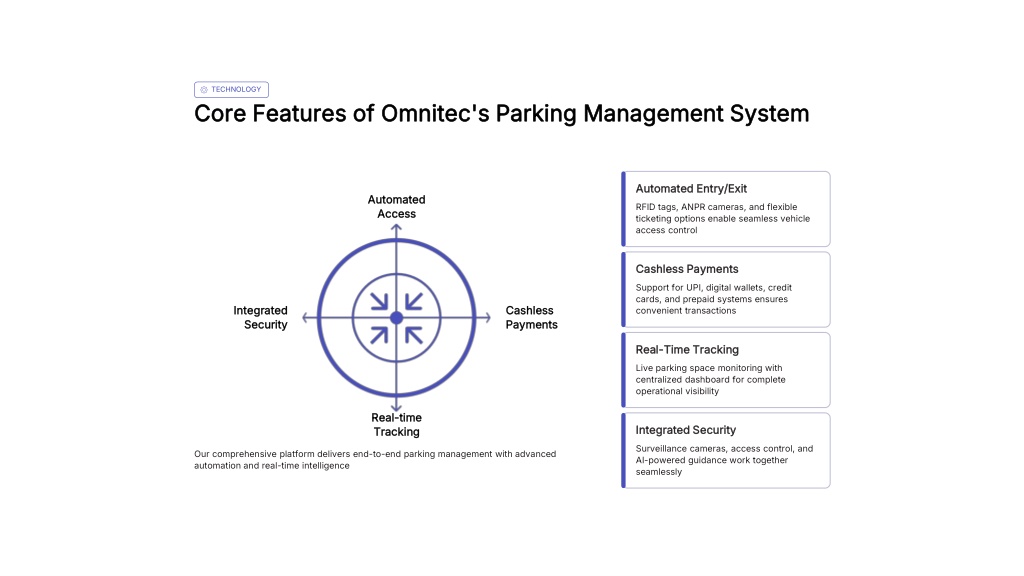 TECHNOLOGY Core Features of Omnitec's Parking Management System Automated Entry/Exit Automated Access RFID tags, ANPR cameras, and flexible ticketing options enable seamless vehicle access control Cashless Payments Support for UPI, digital wallets, credit cards, and prepaid systems ensures convenient transactions Cashless Payments Integrated Security Real-Time Tracking Live parking space monitoring with centralized dashboard for complete operational visibility Real-time Tracking Integrated Security Surveillance cameras, access control, and AI-powered guidance work together seamlessly Our comprehensive platform delivers end-to-end parking management with advanced automation and real-time intelligence