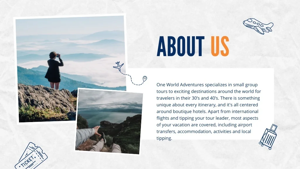ABOUT US One World Adventures specializes in small group tours to exciting destinations around the world for travelers in their 30’s and 40’s. There is something unique about every itinerary, and it's all centered around boutique hotels. Apart from international flights and tipping your tour leader, most aspects of your vacation are covered, including airport transfers, accommodation, activities and local tipping.