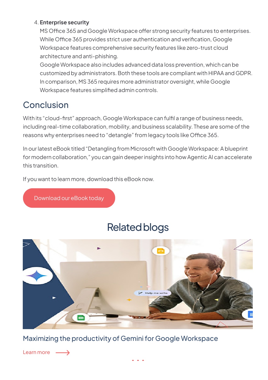 3. ?. Enterprise security MS O?ce 365 and Google Workspace o?er strong security features to enterprises. While O?ce 365 provides strict user authentication and veri?cation, Google Workspace features comprehensive security features like zero-trust cloud architecture and anti-phishing. Google Workspace also includes advanced data loss prevention, which can be customized by administrators. Both these tools are compliant with HIPAA and GDPR. In comparison, MS 365 requires more administrator oversight, while Google Workspace features simpli?ed admin controls. Conclusion With its “cloud-?rst” approach, Google Workspace can ful?l a range of business needs, including real-time collaboration, mobility, and business scalability. These are some of the reasons why enterprises need to “detangle” from legacy tools like O?ce 365. In our latest eBook titled “Detangling from Microsoft with Google Workspace: A blueprint for modern collaboration,” you can gain deeper insights into how Agentic AI can accelerate this transition. If you want to learn more, download this eBook now. Download our eBook today Related blogs Maximizing the productivity of Gemini for Google Workspace Learn more
