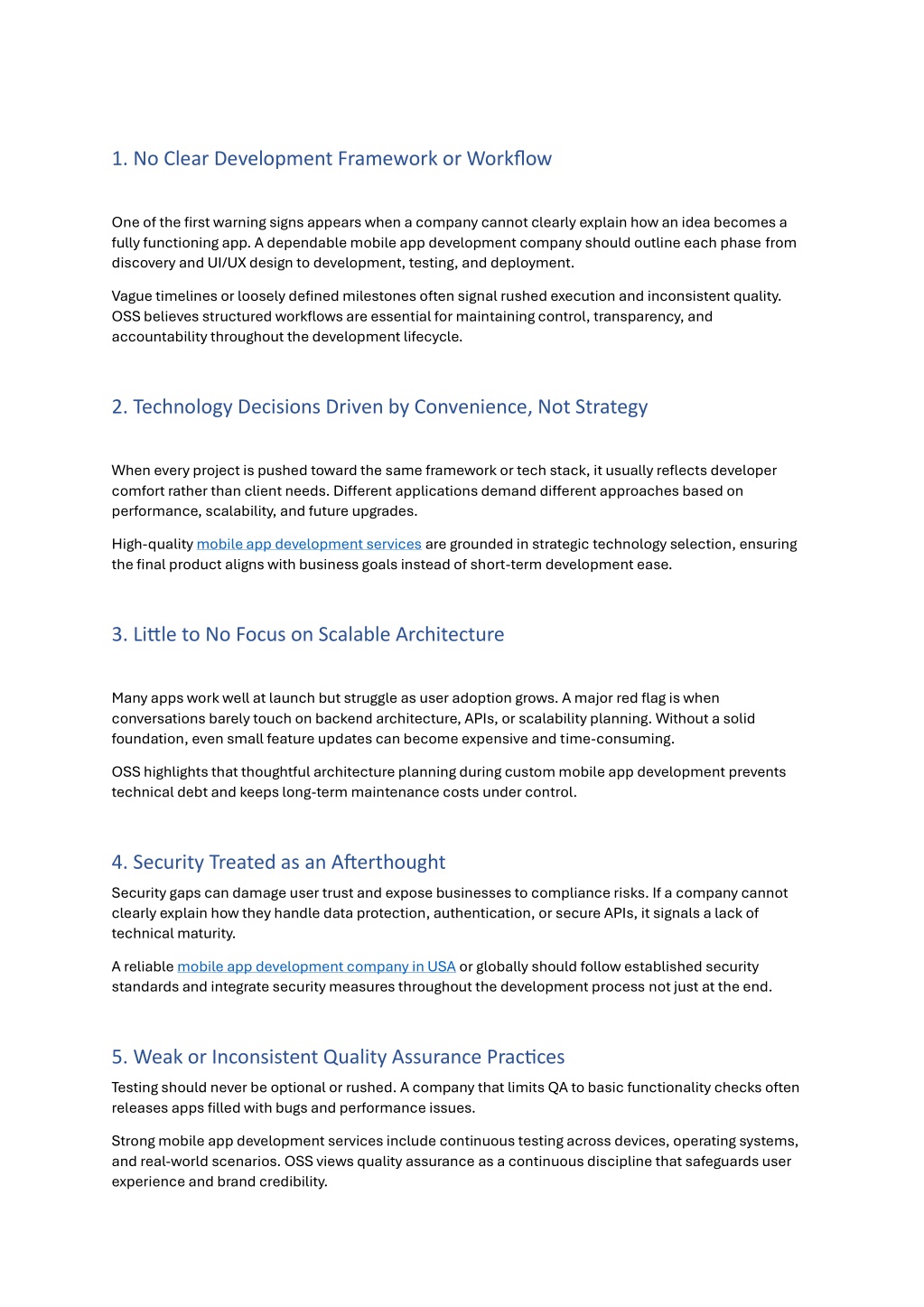 1. No Clear Development Framework or Workflow One of the first warning signs appears when a company cannot clearly explain how an idea becomes a fully functioning app. A dependable mobile app development company should outline each phase from discovery and UI/UX design to development, testing, and deployment. Vague timelines or loosely defined milestones often signal rushed execution and inconsistent quality. OSS believes structured workflows are essential for maintaining control, transparency, and accountability throughout the development lifecycle. 2. Technology Decisions Driven by Convenience, Not Strategy When every project is pushed toward the same framework or tech stack, it usually reflects developer comfort rather than client needs. Different applications demand different approaches based on performance, scalability, and future upgrades. High-quality mobile app development services are grounded in strategic technology selection, ensuring the final product aligns with business goals instead of short-term development ease. 3. Little to No Focus on Scalable Architecture Many apps work well at launch but struggle as user adoption grows. A major red flag is when conversations barely touch on backend architecture, APIs, or scalability planning. Without a solid foundation, even small feature updates can become expensive and time-consuming. OSS highlights that thoughtful architecture planning during custom mobile app development prevents technical debt and keeps long-term maintenance costs under control. 4. Security Treated as an Afterthought Security gaps can damage user trust and expose businesses to compliance risks. If a company cannot clearly explain how they handle data protection, authentication, or secure APIs, it signals a lack of technical maturity. A reliable mobile app development company in USA or globally should follow established security standards and integrate security measures throughout the development process not just at the end. 5. Weak or Inconsistent Quality Assurance Practices Testing should never be optional or rushed. A company that limits QA to basic functionality checks often releases apps filled with bugs and performance issues. Strong mobile app development services include continuous testing across devices, operating systems, and real-world scenarios. OSS views quality assurance as a continuous discipline that safeguards user experience and brand credibility.