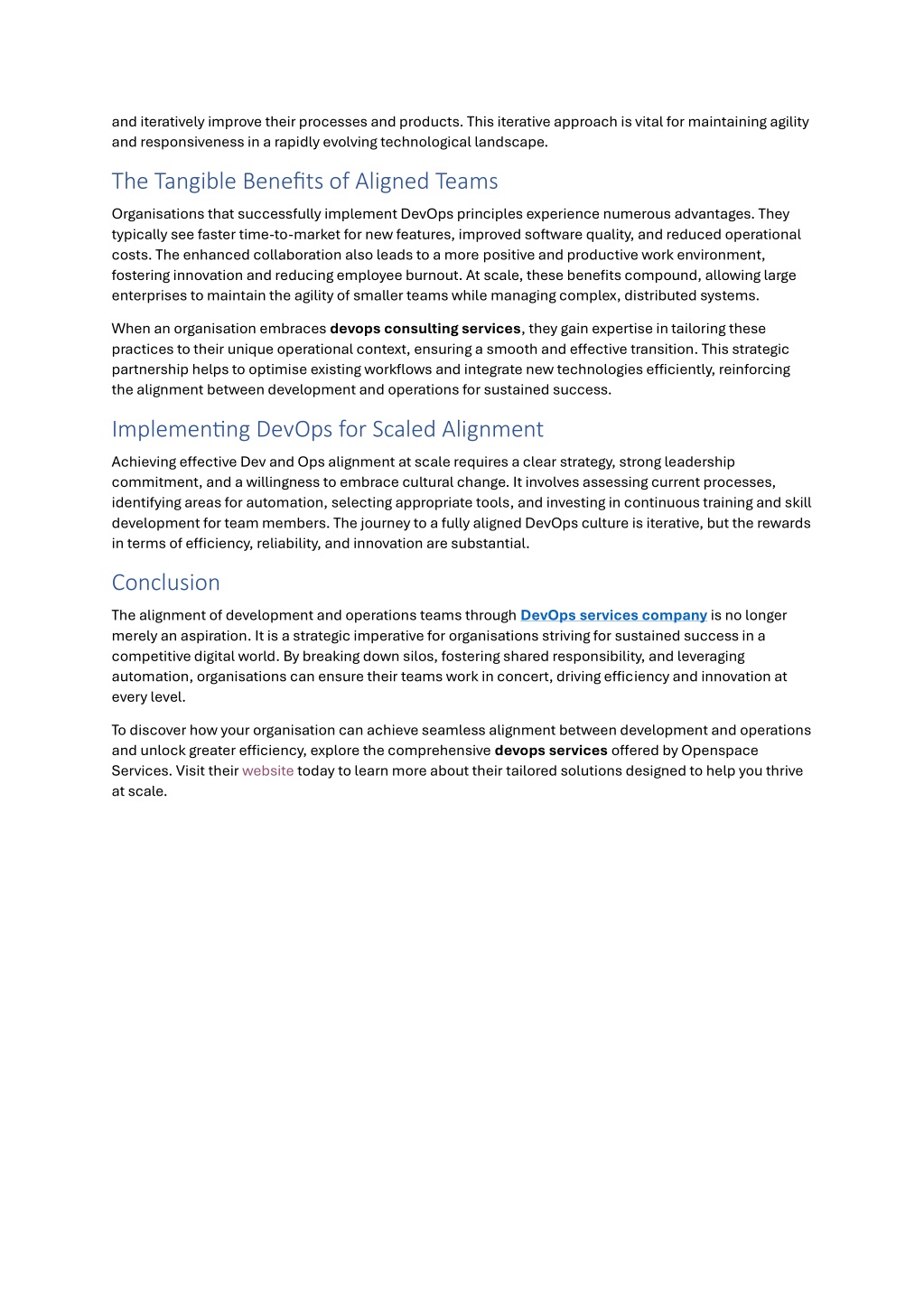 and iteratively improve their processes and products. This iterative approach is vital for maintaining agility and responsiveness in a rapidly evolving technological landscape. The Tangible Benefits of Aligned Teams Organisations that successfully implement DevOps principles experience numerous advantages. They typically see faster time-to-market for new features, improved software quality, and reduced operational costs. The enhanced collaboration also leads to a more positive and productive work environment, fostering innovation and reducing employee burnout. At scale, these benefits compound, allowing large enterprises to maintain the agility of smaller teams while managing complex, distributed systems. When an organisation embracesdevops consulting services, they gain expertise in tailoring these practices to their unique operational context, ensuring a smooth and effective transition. This strategic partnership helps to optimise existing workflows and integrate new technologies efficiently, reinforcing the alignment between development and operations for sustained success. Implementing DevOps for Scaled Alignment Achieving effective Dev and Ops alignment at scale requires a clear strategy, strong leadership commitment, and a willingness to embrace cultural change. It involves assessing current processes, identifying areas for automation, selecting appropriate tools, and investing in continuous training and skill development for team members. The journey to a fully aligned DevOps culture is iterative, but the rewards in terms of efficiency, reliability, and innovation are substantial. Conclusion The alignment of development and operations teams through DevOps services company is no longer merely an aspiration. It is a strategic imperative for organisations striving for sustained success in a competitive digital world. By breaking down silos, fostering shared responsibility, and leveraging automation, organisations can ensure their teams work in concert, driving efficiency and innovation at every level. To discover how your organisation can achieve seamless alignment between development and operations and unlock greater efficiency, explore the comprehensivedevops servicesoffered by Openspace Services. Visit their websitetoday to learn more about their tailored solutions designed to help you thrive at scale.