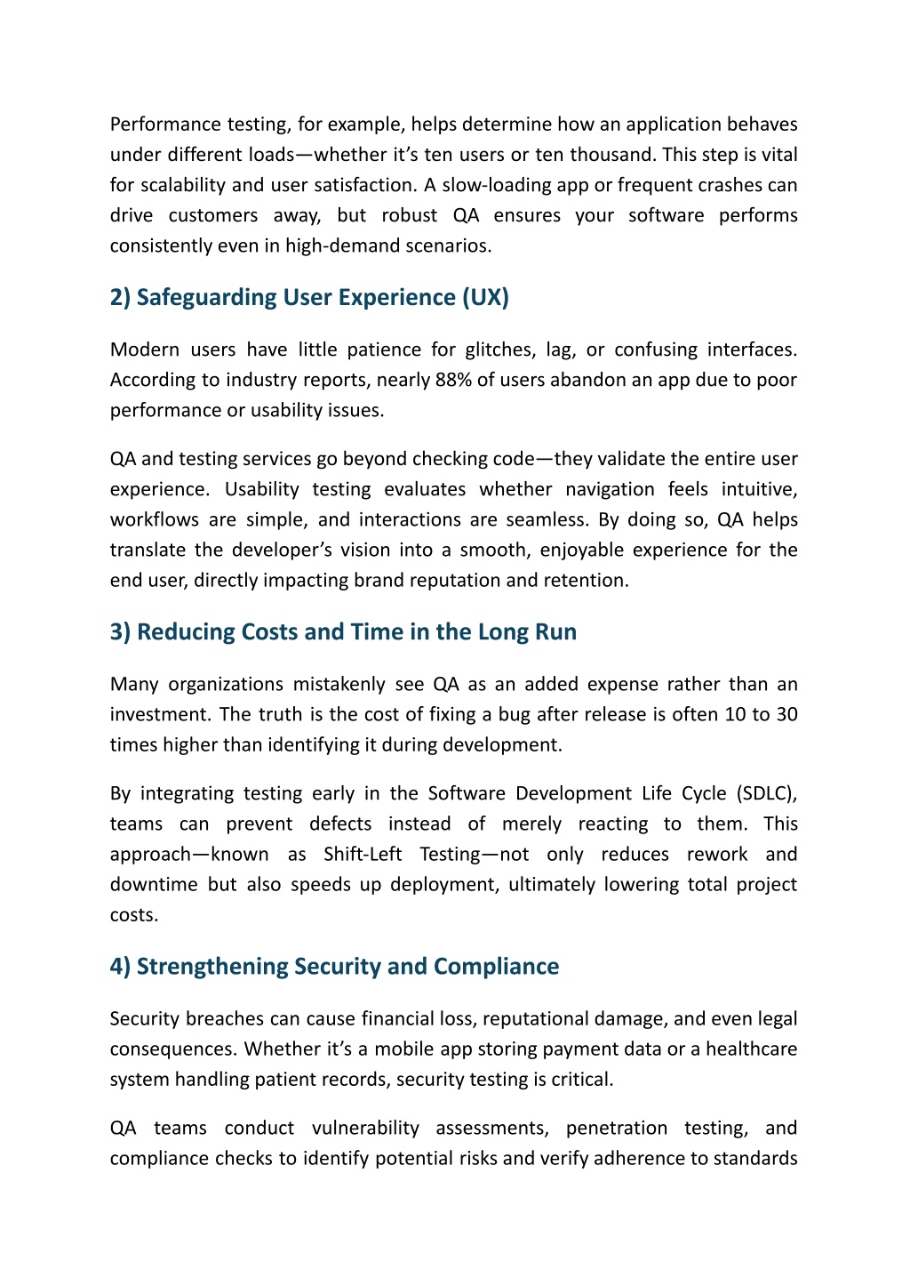 2. Performance testing, for example, helps determine how an application behaves under different loads—whether it’s ten users or ten thousand. This step is vital for scalability and user satisfaction. A slow-loading app or frequent crashes can drive customers away, but robust QA ensures your software performs consistently even in high-demand scenarios. 2) Safeguarding User Experience (UX) Modern users have little patience for glitches, lag, or confusing interfaces. According to industry reports, nearly 88% of users abandon an app due to poor performance or usability issues. QA and testing services go beyond checking code—they validate the entire user experience. Usability testing evaluates whether navigation feels intuitive, workflows are simple, and interactions are seamless. By doing so, QA helps translate the developer’s vision into a smooth, enjoyable experience for the end user, directly impacting brand reputation and retention. 3) Reducing Costs and Time in the Long Run Many organizations mistakenly see QA as an added expense rather than an investment. The truth is the cost of fixing a bug after release is often 10 to 30 times higher than identifying it during development. By integrating testing early in the Software Development Life Cycle (SDLC), teams can prevent defects instead of merely reacting to them. This approach—known as Shift-Left Testing—not only reduces rework and downtime but also speeds up deployment, ultimately lowering total project costs. 4) Strengthening Security and Compliance Security breaches can cause financial loss, reputational damage, and even legal consequences. Whether it’s a mobile app storing payment data or a healthcare system handling patient records, security testing is critical. QA teams conduct vulnerability assessments, penetration testing, and compliance checks to identify potential risks and verify adherence to standards