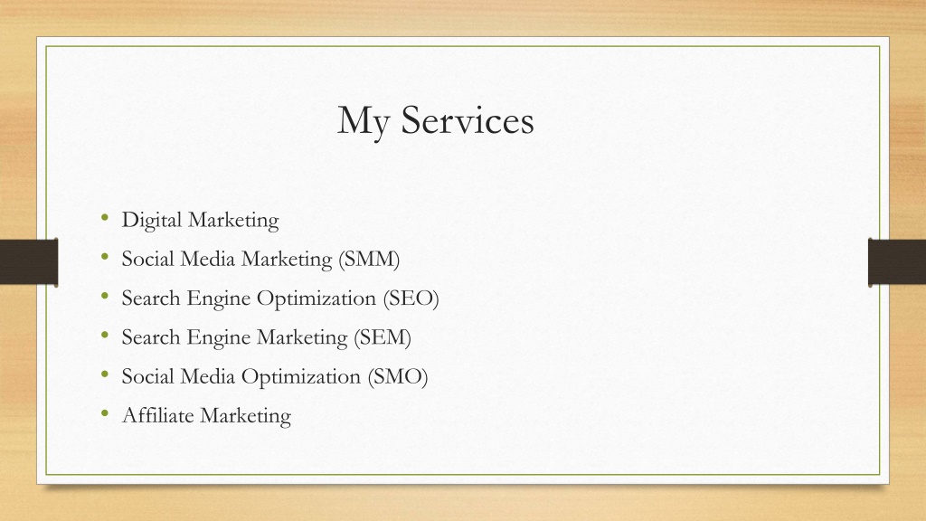 My Services • Digital Marketing • Social Media Marketing (SMM) • Search Engine Optimization (SEO) • Search Engine Marketing (SEM) • Social Media Optimization (SMO) • Affiliate Marketing