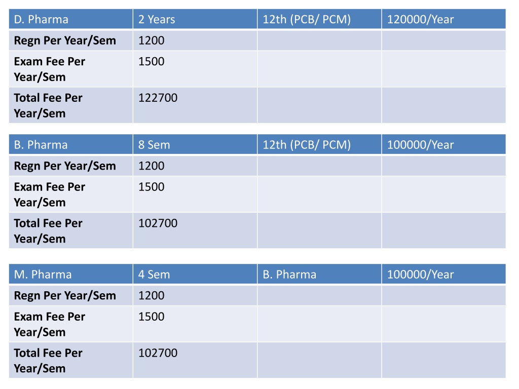 D. Pharma 2 Years 12th (PCB/ PCM) 120000/Year Regn Per Year/Sem 1200 Exam Fee Per Year/Sem 1500 Total Fee Per Year/Sem 122700 B. Pharma 8 Sem 12th (PCB/ PCM) 100000/Year Regn Per Year/Sem 1200 Exam Fee Per Year/Sem 1500 Total Fee Per Year/Sem 102700 M. Pharma 4 Sem B. Pharma 100000/Year Regn Per Year/Sem 1200 Exam Fee Per Year/Sem 1500 Total Fee Per Year/Sem 102700