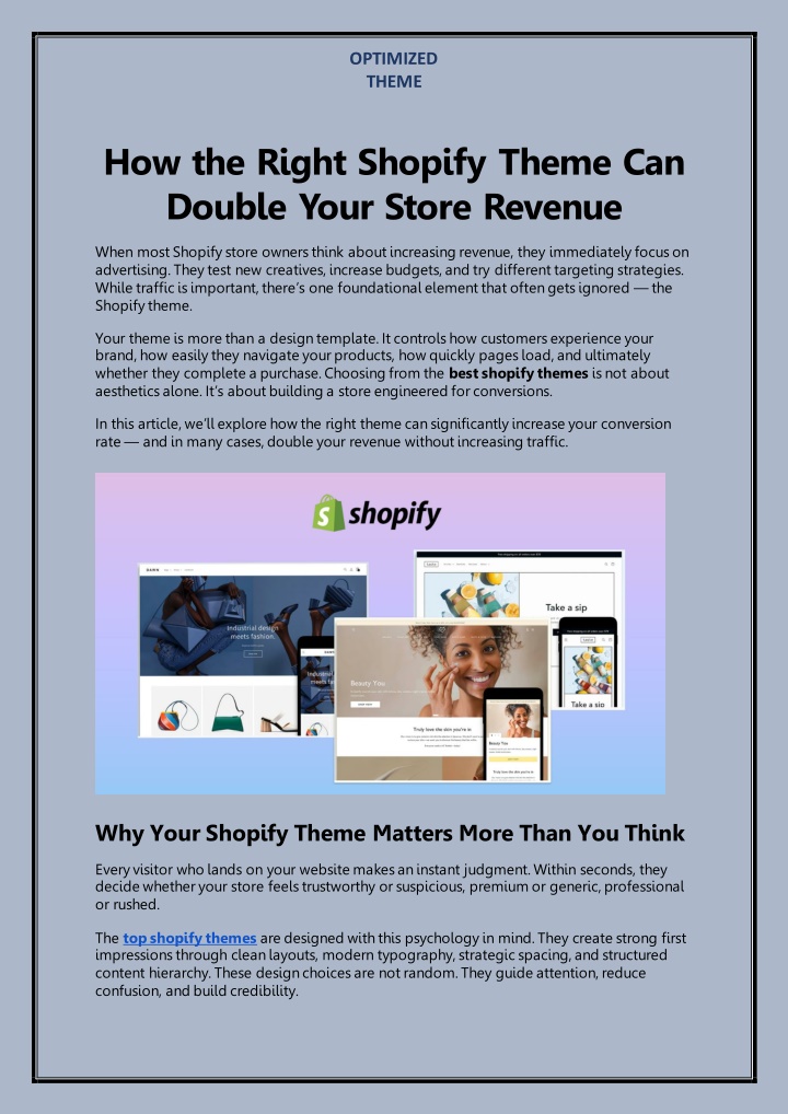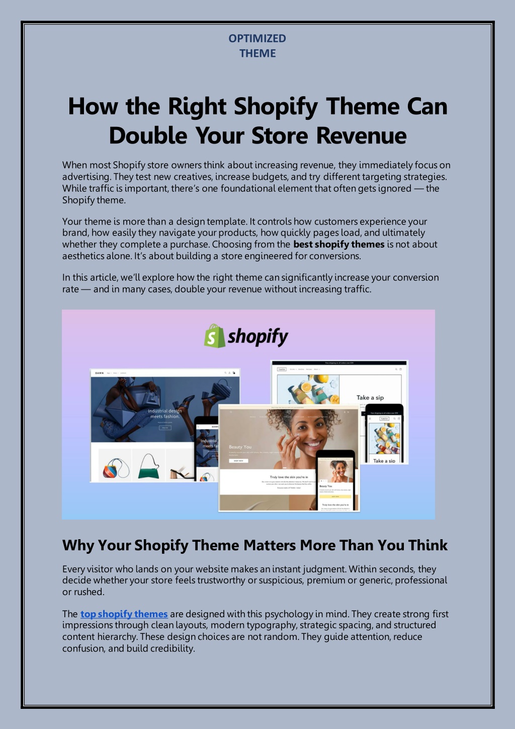 OPTIMIZED THEME How the Right Shopify Theme Can Double Your Store Revenue When most Shopify store owners think about increasing revenue, they immediately focus on advertising. They test new creatives, increase budgets, and try different targeting strategies. While traffic is important, there’s one foundational element that often gets ignored — the Shopify theme. Your theme is more than a design template. It controls how customers experience your brand, how easily they navigate your products, how quickly pages load, and ultimately whether they complete a purchase. Choosing from the best shopify themes is not about aesthetics alone. It’s about building a store engineered for conversions. In this article, we’ll explore how the right theme can significantly increase your conversion rate — and in many cases, double your revenue without increasing traffic. Why Your Shopify Theme Matters More Than You Think Every visitor who lands on your website makes an instant judgment. Within seconds, they decide whether your store feels trustworthy or suspicious, premium or generic, professional or rushed. The top shopify themes are designed with this psychology in mind. They create strong first impressions through clean layouts, modern typography, strategic spacing, and structured content hierarchy. These design choices are not random. They guide attention, reduce confusion, and build credibility.