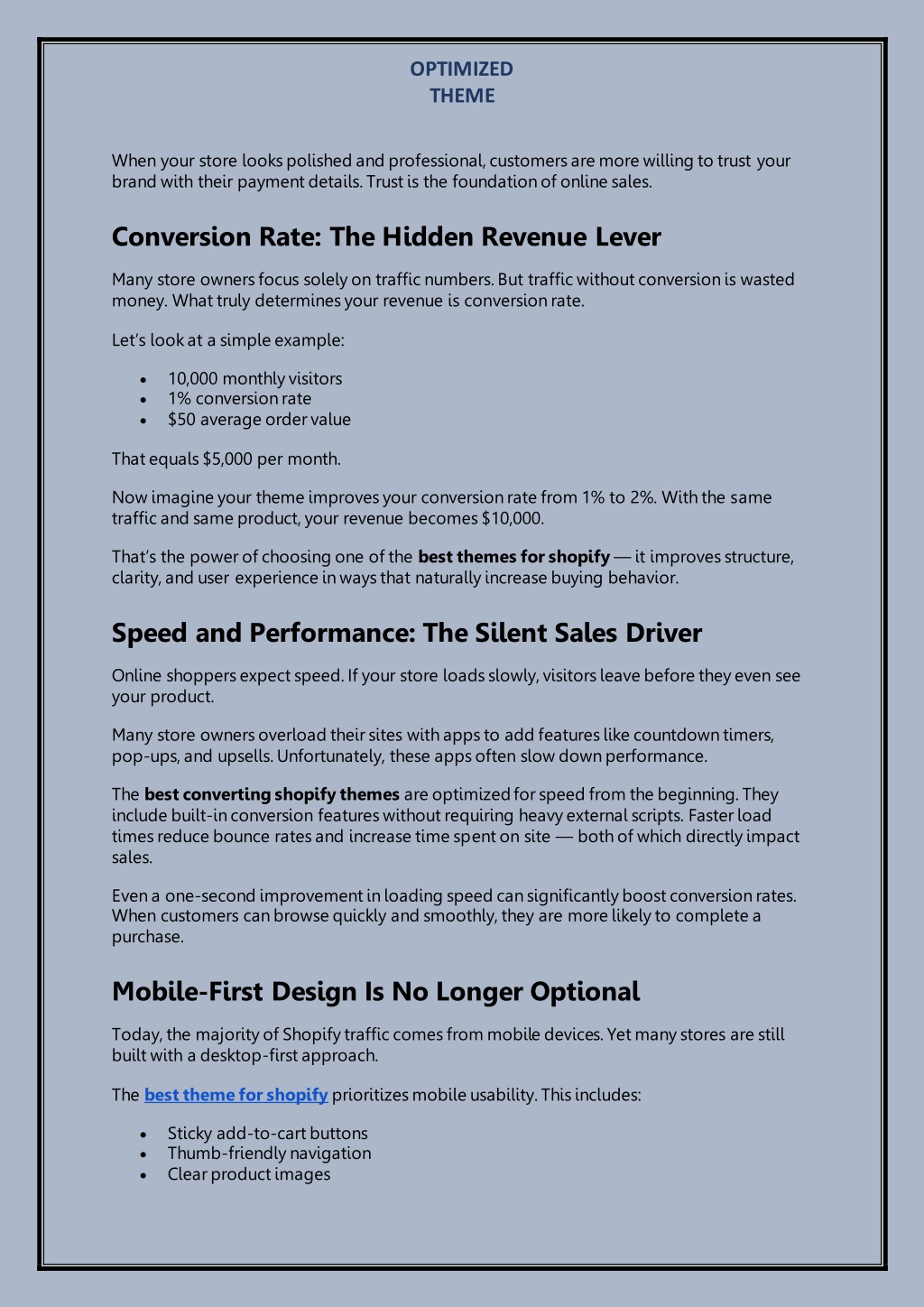 OPTIMIZED THEME When your store looks polished and professional, customers are more willing to trust your brand with their payment details. Trust is the foundation of online sales. Conversion Rate: The Hidden Revenue Lever Many store owners focus solely on traffic numbers. But traffic without conversion is wasted money. What truly determines your revenue is conversion rate. Let’s look at a simple example: 10,000 monthly visitors 1% conversion rate $50 average order value • • • That equals $5,000 per month. Now imagine your theme improves your conversion rate from 1% to 2%. With the same traffic and same product, your revenue becomes $10,000. That’s the power of choosing one of the best themes for shopify— it improves structure, clarity, and user experience in ways that naturally increase buying behavior. Speed and Performance: The Silent Sales Driver Online shoppers expect speed. If your store loads slowly, visitors leave before they even see your product. Many store owners overload their sites with apps to add features like countdown timers, pop-ups, and upsells. Unfortunately, these apps often slow down performance. The best converting shopify themes are optimized for speed from the beginning. They include built-in conversion features without requiring heavy external scripts. Faster load times reduce bounce rates and increase time spent on site — both of which directly impact sales. Even a one-second improvement in loading speed can significantly boost conversion rates. When customers can browse quickly and smoothly, they are more likely to complete a purchase. Mobile-First Design Is No Longer Optional Today, the majority of Shopify traffic comes from mobile devices. Yet many stores are still built with a desktop-first approach. The best theme for shopify prioritizes mobile usability. This includes: Sticky add-to-cart buttons Thumb-friendly navigation Clear product images • • •