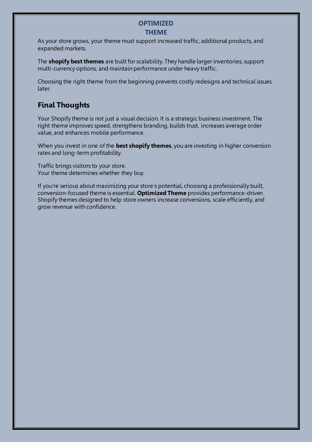 OPTIMIZED THEME As your store grows, your theme must support increased traffic, additional products, and expanded markets. The shopify best themes are built for scalability. They handle larger inventories, support multi-currency options, and maintain performance under heavy traffic. Choosing the right theme from the beginning prevents costly redesigns and technical issues later. Final Thoughts Your Shopify theme is not just a visual decision. It is a strategic business investment. The right theme improves speed, strengthens branding, builds trust, increases average order value, and enhances mobile performance. When you invest in one of the best shopify themes, you are investing in higher conversion rates and long-term profitability. Traffic brings visitors to your store. Your theme determines whether they buy. If you’re serious about maximizing your store’s potential, choosing a professionally built, conversion-focused theme is essential. Optimized Theme provides performance-driven Shopify themes designed to help store owners increase conversions, scale efficiently, and grow revenue with confidence.