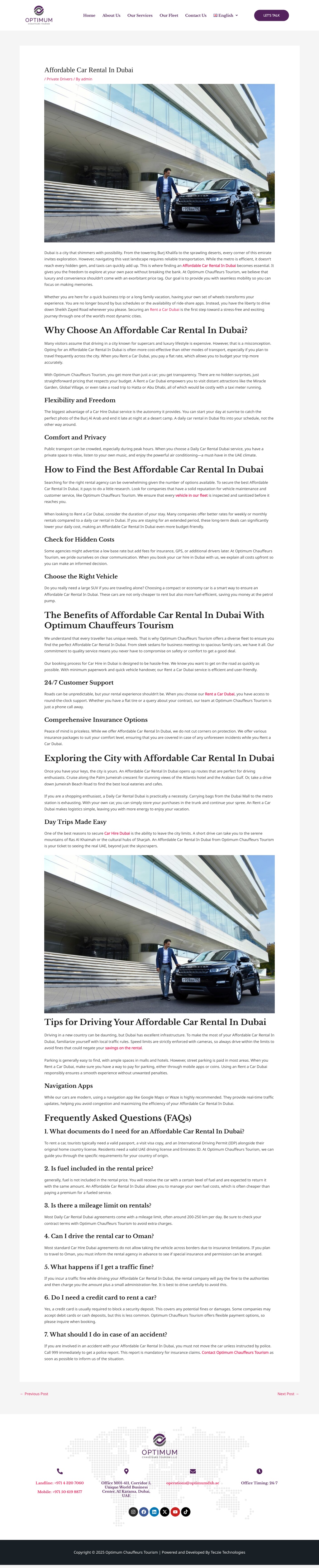 Home About Us Our Services Our Fleet Contact Us English LET'S TALK Affordable Car Rental In Dubai / Private Drivers / By admin Dubai is a city that shimmers with possibility. From the towering Burj Khalifa to the sprawling deserts, every corner of this emirate invites exploration. However, navigating this vast landscape requires reliable transportation. While the metro is efficient, it doesn’t reach every hidden gem, and taxis can quickly add up. This is where finding an Affordable Car Rental In Dubai becomes essential. It gives you the freedom to explore at your own pace without breaking the bank. At Optimum Chauffeurs Tourism, we believe that luxury and convenience shouldn’t come with an exorbitant price tag. Our goal is to provide you with seamless mobility so you can focus on making memories. Whether you are here for a quick business trip or a long family vacation, having your own set of wheels transforms your experience. You are no longer bound by bus schedules or the availability of ride-share apps. Instead, you have the liberty to drive down Sheikh Zayed Road whenever you please. Securing an Rent a Car Dubai is the first step toward a stress-free and exciting journey through one of the world’s most dynamic cities. Why Choose An Affordable Car Rental In Dubai? Many visitors assume that driving in a city known for supercars and luxury lifestyle is expensive. However, that is a misconception. Opting for an Affordable Car Rental In Dubai is often more cost-effective than other modes of transport, especially if you plan to travel frequently across the city. When you Rent a Car Dubai, you pay a flat rate, which allows you to budget your trip more accurately. With Optimum Chauffeurs Tourism, you get more than just a car; you get transparency. There are no hidden surprises, just straightforward pricing that respects your budget. A Rent a Car Dubai empowers you to visit distant attractions like the Miracle Garden, Global Village, or even take a road trip to Hatta or Abu Dhabi, all of which would be costly with a taxi meter running. Flexibility and Freedom The biggest advantage of a Car Hire Dubai service is the autonomy it provides. You can start your day at sunrise to catch the perfect photo of the Burj Al Arab and end it late at night at a desert camp. A daily car rental in Dubai fits into your schedule, not the other way around. Comfort and Privacy Public transport can be crowded, especially during peak hours. When you choose a Daily Car Rental Dubai service, you have a private space to relax, listen to your own music, and enjoy the powerful air conditioning—a must-have in the UAE climate. How to Find the Best Affordable Car Rental In Dubai Searching for the right rental agency can be overwhelming given the number of options available. To secure the best Affordable Car Rental In Dubai, it pays to do a little research. Look for companies that have a solid reputation for vehicle maintenance and customer service, like Optimum Chauffeurs Tourism. We ensure that every vehicle in our fleet is inspected and sanitized before it reaches you. When looking to Rent a Car Dubai, consider the duration of your stay. Many companies offer better rates for weekly or monthly rentals compared to a daily car rental in Dubai. If you are staying for an extended period, these long-term deals can significantly lower your daily cost, making an Affordable Car Rental In Dubai even more budget-friendly. Check for Hidden Costs Some agencies might advertise a low base rate but add fees for insurance, GPS, or additional drivers later. At Optimum Chauffeurs Tourism, we pride ourselves on clear communication. When you book your car hire in Dubai with us, we explain all costs upfront so you can make an informed decision. Choose the Right Vehicle Do you really need a large SUV if you are traveling alone? Choosing a compact or economy car is a smart way to ensure an Affordable Car Rental In Dubai. These cars are not only cheaper to rent but also more fuel-efficient, saving you money at the petrol pump. The Benefits of Affordable Car Rental In Dubai With Optimum Chauffeurs Tourism We understand that every traveller has unique needs. That is why Optimum Chauffeurs Tourism offers a diverse fleet to ensure you find the perfect Affordable Car Rental In Dubai. From sleek sedans for business meetings to spacious family cars, we have it all. Our commitment to quality service means you never have to compromise on safety or comfort to get a good deal. Our booking process for Car Hire in Dubai is designed to be hassle-free. We know you want to get on the road as quickly as possible. With minimum paperwork and quick vehicle handover, our Rent a Car Dubai service is efficient and user-friendly. 24/7 Customer Support Roads can be unpredictable, but your rental experience shouldn’t be. When you choose our Rent a Car Dubai, you have access to round-the-clock support. Whether you have a flat tire or a query about your contract, our team at Optimum Chauffeurs Tourism is just a phone call away. Comprehensive Insurance Options Peace of mind is priceless. While we offer Affordable Car Rental In Dubai, we do not cut corners on protection. We offer various insurance packages to suit your comfort level, ensuring that you are covered in case of any unforeseen incidents while you Rent a Car Dubai. Exploring the City with Affordable Car Rental In Dubai Once you have your keys, the city is yours. An Affordable Car Rental In Dubai opens up routes that are perfect for driving enthusiasts. Cruise along the Palm Jumeirah crescent for stunning views of the Atlantis hotel and the Arabian Gulf. Or, take a drive down Jumeirah Beach Road to find the best local eateries and cafes. If you are a shopping enthusiast, a Daily Car Rental Dubai is practically a necessity. Carrying bags from the Dubai Mall to the metro station is exhausting. With your own car, you can simply store your purchases in the trunk and continue your spree. An Rent a Car Dubai make