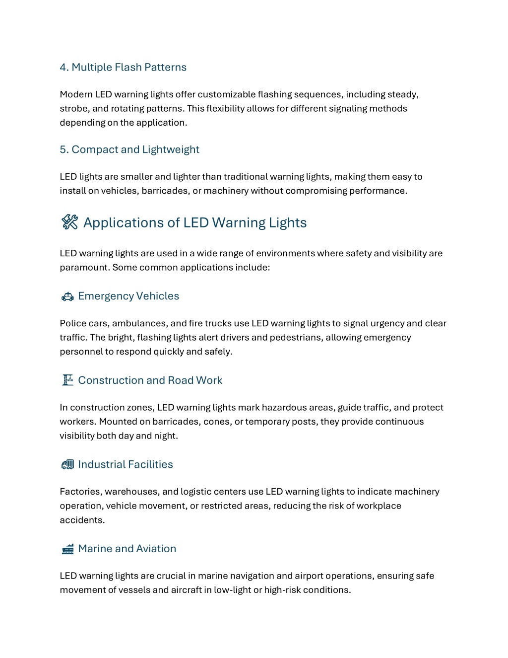 ? What Are LED Warning Lights? LED (Light Emitting Diode) warning lights are specialized lighting devices designed to alert or guide people in situations where immediate attention is required. They are widely used in: •Road safety and traffic management •Emergency response vehicles like ambulances, fire trucks, and police cars •Construction sites and industrial workplaces •Airports, docks, and other high-traffic operational areas Unlike traditional incandescent or halogen lights, LEDs provide instant illumination, consume less energy, and last significantly longer. Their bright, focused light ensures visibility even in poor weather, fog, or nighttime conditions, making them ideal for safety- critical applications. ⚙️ Key Features of LED Warning Lights LED warning lights are valued for their efficiency, reliability, and versatility. Here are some of their defining features: 1. High Visibility LEDs emit bright, concentrated light that can be seen from long distances. Many warning lights include flashing or rotating patterns to draw attention, ensuring maximum visibility in critical situations. 2. Energy Efficiency LED technology consumes significantly less power than traditional lighting systems. This translates to longer battery life in portable units and reduced energy costs for stationary installations. 3. Durability and Longevity LED warning lights are shock-resistant, vibration-resistant, and weatherproof, capable of withstanding harsh outdoor conditions. With a lifespan exceeding 50,000 hours, they require minimal maintenance and replacement.