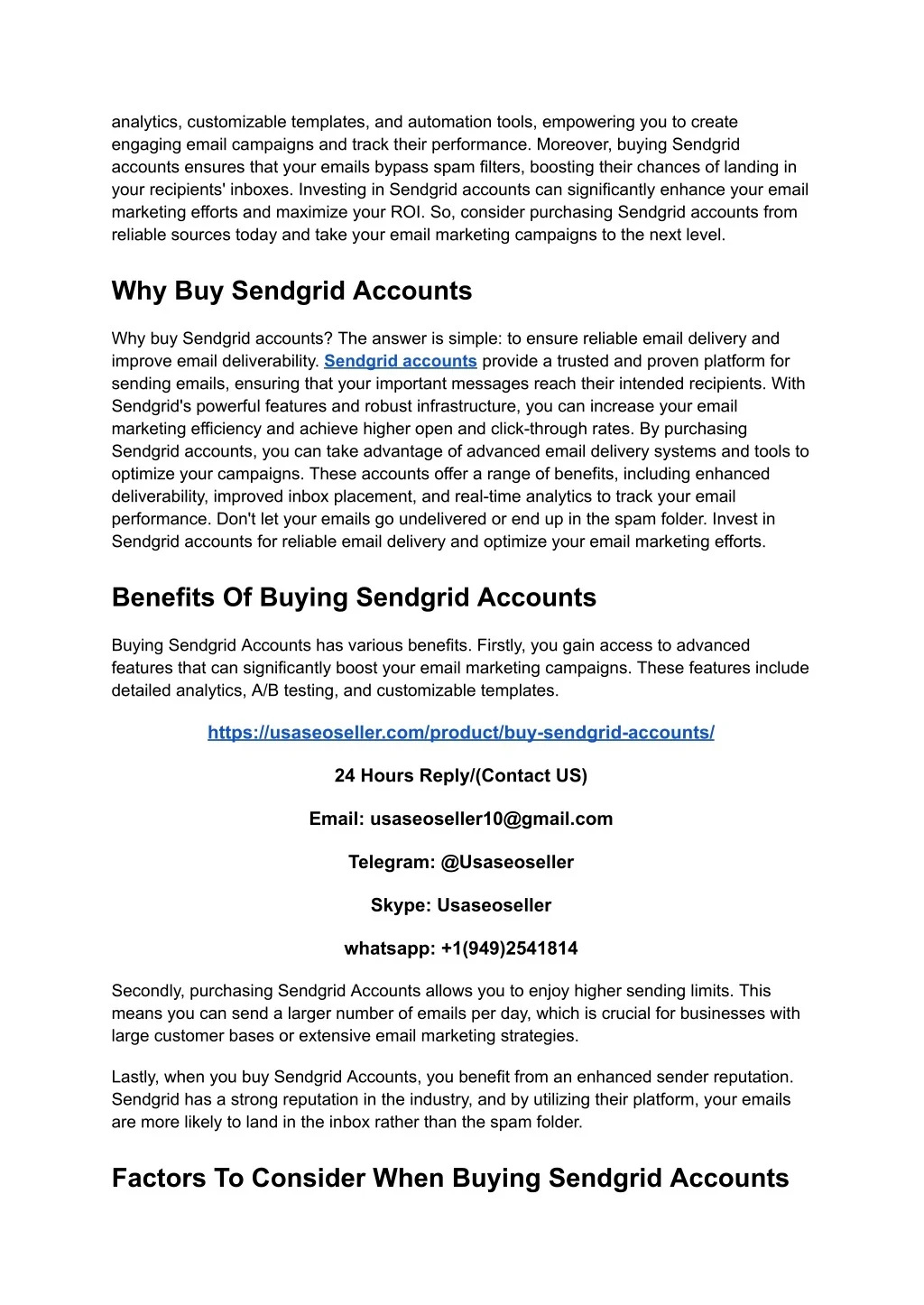 analytics, customizable templates, and automation tools, empowering you to create engaging email campaigns and track their performance. Moreover, buying Sendgrid accounts ensures that your emails bypass spam filters, boosting their chances of landing in your recipients' inboxes. Investing in Sendgrid accounts can significantly enhance your email marketing efforts and maximize your ROI. So, consider purchasing Sendgrid accounts from reliable sources today and take your email marketing campaigns to the next level. Why Buy Sendgrid Accounts Why buy Sendgrid accounts? The answer is simple: to ensure reliable email delivery and improve email deliverability. Sendgrid accounts provide a trusted and proven platform for sending emails, ensuring that your important messages reach their intended recipients. With Sendgrid's powerful features and robust infrastructure, you can increase your email marketing efficiency and achieve higher open and click-through rates. By purchasing Sendgrid accounts, you can take advantage of advanced email delivery systems and tools to optimize your campaigns. These accounts offer a range of benefits, including enhanced deliverability, improved inbox placement, and real-time analytics to track your email performance. Don't let your emails go undelivered or end up in the spam folder. Invest in Sendgrid accounts for reliable email delivery and optimize your email marketing efforts. Benefits Of Buying Sendgrid Accounts Buying Sendgrid Accounts has various benefits. Firstly, you gain access to advanced features that can significantly boost your email marketing campaigns. These features include detailed analytics, A/B testing, and customizable templates. https://usaseoseller.com/product/buy-sendgrid-accounts/ 24 Hours Reply/(Contact US) Email: usaseoseller10@gmail.com Telegram: @Usaseoseller Skype: Usaseoseller whatsapp: +1(949)2541814 Secondly, purchasing Sendgrid Accounts allows you to enjoy higher sending limits. This means you can send a larger number of emails per day, which is crucial for businesses with large customer bases or extensive email marketing strategies. Lastly, when you buy Sendgrid Accounts, you benefit from an enhanced sender reputation. Sendgrid has a strong reputation in the industry, and by utilizing their platform, your emails are more likely to land in the inbox rather than the spam folder. Factors To Consider When Buying Sendgrid Accounts