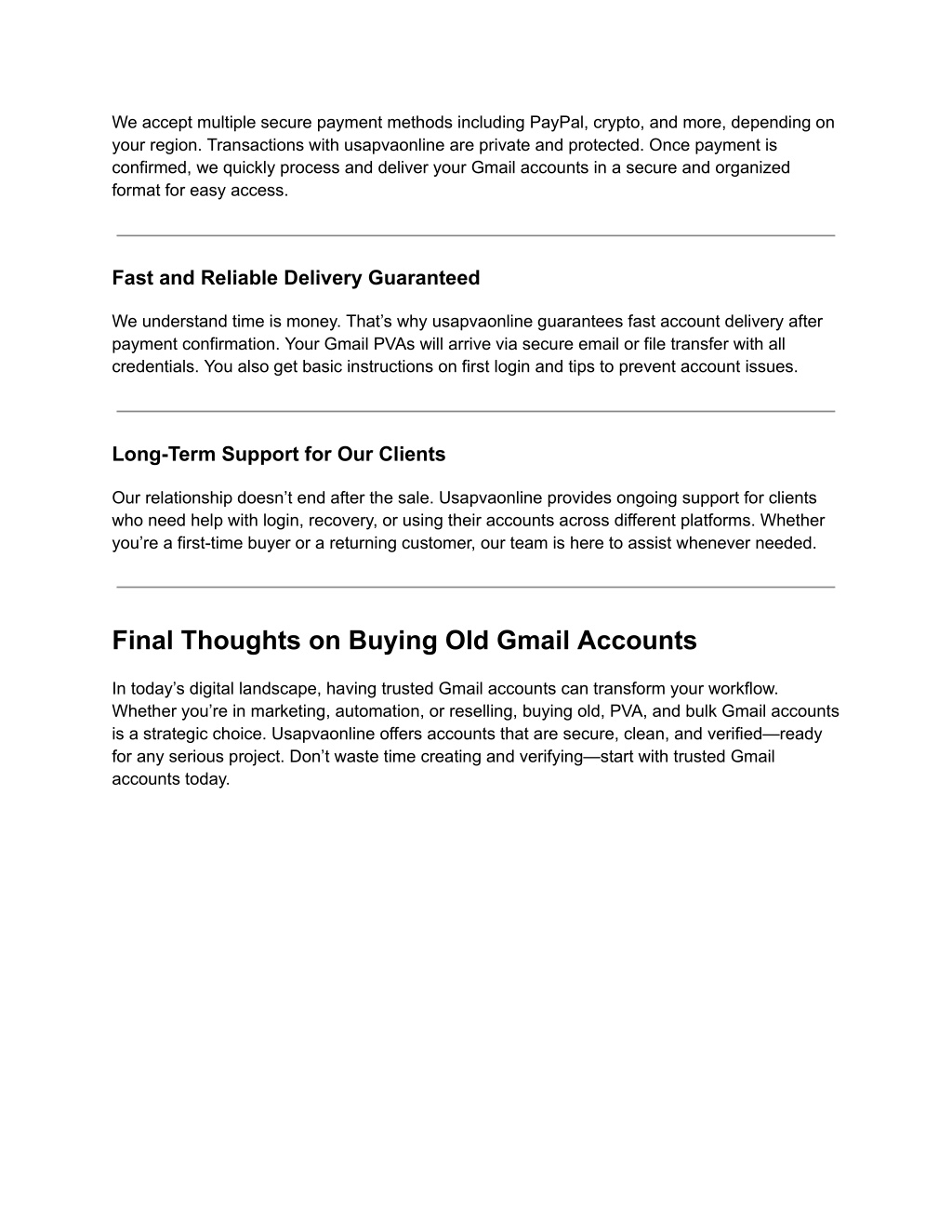 We accept multiple secure payment methods including PayPal, crypto, and more, depending on your region. Transactions with usapvaonline are private and protected. Once payment is confirmed, we quickly process and deliver your Gmail accounts in a secure and organized format for easy access. Fast and Reliable Delivery Guaranteed We understand time is money. That’s why usapvaonline guarantees fast account delivery after payment confirmation. Your Gmail PVAs will arrive via secure email or file transfer with all credentials. You also get basic instructions on first login and tips to prevent account issues. Long-Term Support for Our Clients Our relationship doesn’t end after the sale. Usapvaonline provides ongoing support for clients who need help with login, recovery, or using their accounts across different platforms. Whether you’re a first-time buyer or a returning customer, our team is here to assist whenever needed. Final Thoughts on Buying Old Gmail Accounts In today’s digital landscape, having trusted Gmail accounts can transform your workflow. Whether you’re in marketing, automation, or reselling, buying old, PVA, and bulk Gmail accounts is a strategic choice. Usapvaonline offers accounts that are secure, clean, and verified—ready for any serious project. Don’t waste time creating and verifying—start with trusted Gmail accounts today.
