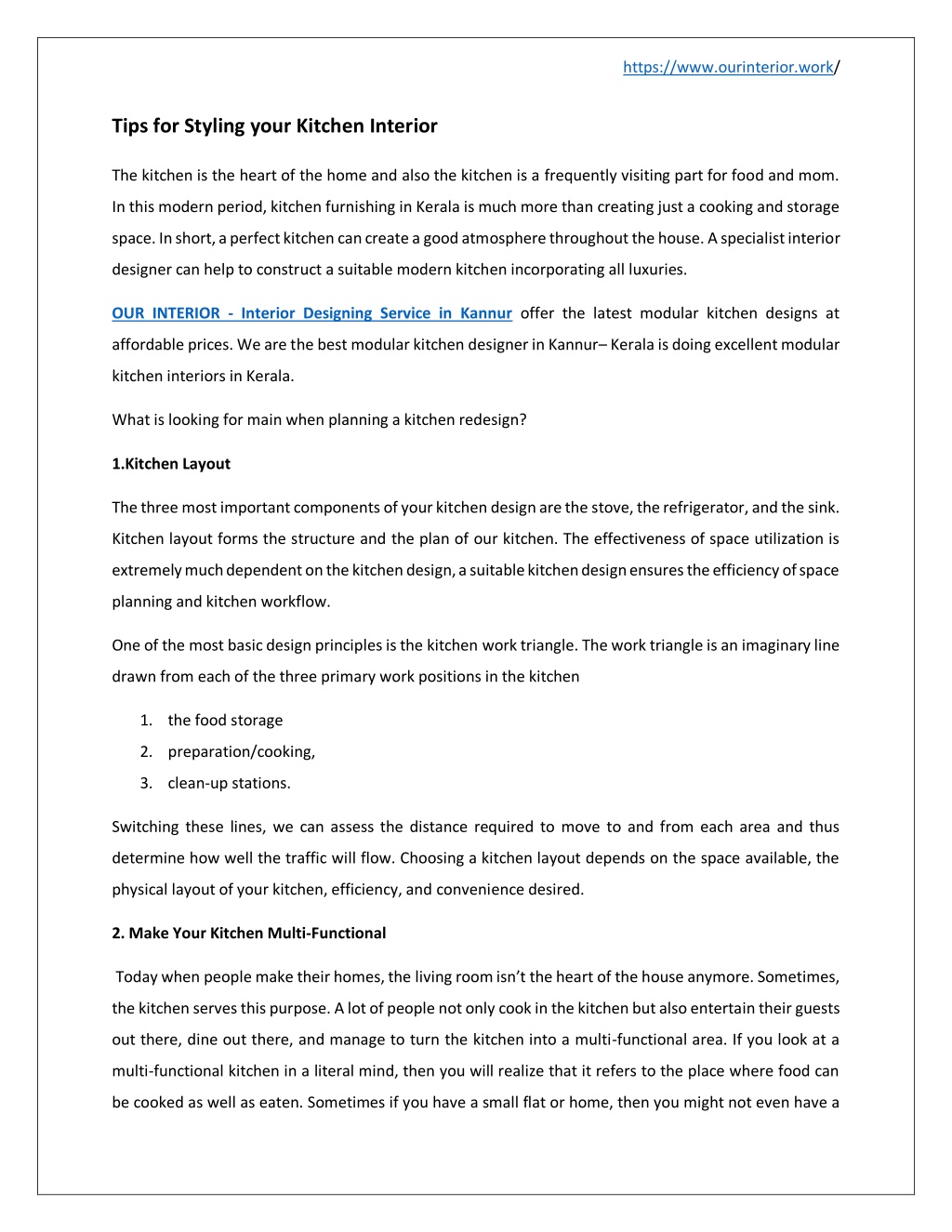 https://www.ourinterior.work/ Tips for Styling your Kitchen Interior The kitchen is the heart of the home and also the kitchen is a frequently visiting part for food and mom. In this modern period, kitchen furnishing in Kerala is much more than creating just a cooking and storage space. In short, a perfect kitchen can create a good atmosphere throughout the house. A specialist interior designer can help to construct a suitable modern kitchen incorporating all luxuries. OUR INTERIOR - Interior Designing Service in Kannur offer the latest modular kitchen designs at affordable prices. We are the best modular kitchen designer in Kannur– Kerala is doing excellent modular kitchen interiors in Kerala. What is looking for main when planning a kitchen redesign? 1.Kitchen Layout The three most important components of your kitchen design are the stove, the refrigerator, and the sink. Kitchen layout forms the structure and the plan of our kitchen. The effectiveness of space utilization is extremely much dependent on the kitchen design, a suitable kitchen design ensures the efficiency of space planning and kitchen workflow. One of the most basic design principles is the kitchen work triangle. The work triangle is an imaginary line drawn from each of the three primary work positions in the kitchen 1.the food storage 2.preparation/cooking, 3.clean-up stations. Switching these lines, we can assess the distance required to move to and from each area and thus determine how well the traffic will flow. Choosing a kitchen layout depends on the space available, the physical layout of your kitchen, efficiency, and convenience desired. 2. Make Your Kitchen Multi-Functional Today when people make their homes, the living room isn’t the heart of the house anymore. Sometimes, the kitchen serves this purpose. A lot of people not only cook in the kitchen but also entertain their guests out there, dine out there, and manage to turn the kitchen into a multi-functional area. If you look at a multi-functional kitchen in a literal mind, then you will realize that it refers to the place where food can be cooked as well as eaten. Sometimes if you have a small flat or home, then you might not even have a
