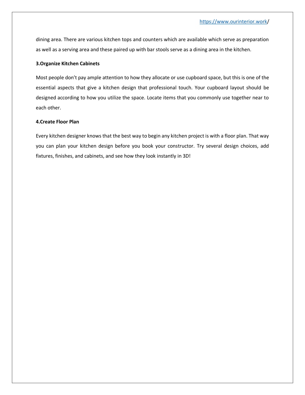 https://www.ourinterior.work/ dining area. There are various kitchen tops and counters which are available which serve as preparation as well as a serving area and these paired up with bar stools serve as a dining area in the kitchen. 3.Organize Kitchen Cabinets Most people don’t pay ample attention to how they allocate or use cupboard space, but this is one of the essential aspects that give a kitchen design that professional touch. Your cupboard layout should be designed according to how you utilize the space. Locate items that you commonly use together near to each other. 4.Create Floor Plan Every kitchen designer knows that the best way to begin any kitchen project is with a floor plan. That way you can plan your kitchen design before you book your constructor. Try several design choices, add fixtures, finishes, and cabinets, and see how they look instantly in 3D!