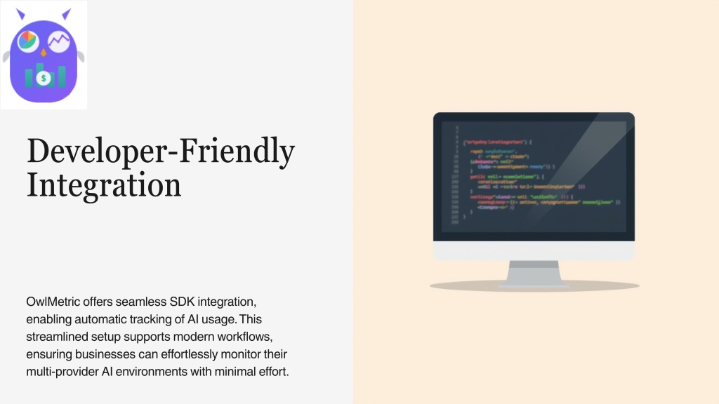 11. Developer-Friendly Integration • OwlMetric offers seamless SDK integration, enabling automatic tracking of AI usage. This streamlined setup supports modern workflows, ensuring businesses can effortlessly monitor their multi-provider AI environments with minimal effort.