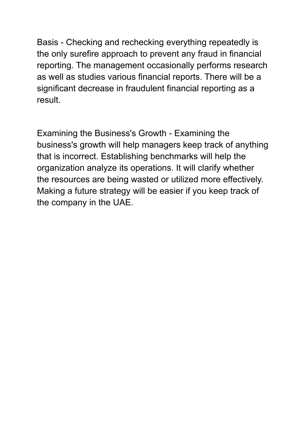 Basis - Checking and rechecking everything repeatedly is the only surefire approach to prevent any fraud in financial reporting. The management occasionally performs research as well as studies various financial reports. There will be a significant decrease in fraudulent financial reporting as a result. Examining the Business's Growth - Examining the business's growth will help managers keep track of anything that is incorrect. Establishing benchmarks will help the organization analyze its operations. It will clarify whether the resources are being wasted or utilized more effectively. Making a future strategy will be easier if you keep track of the company in the UAE.