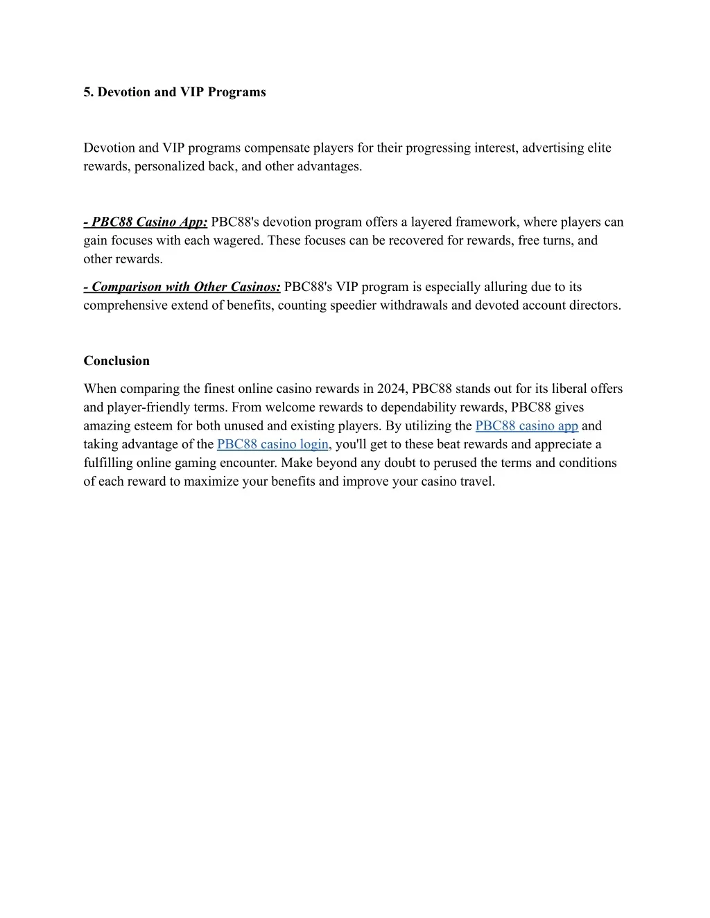 5. Devotion and VIP Programs Devotion and VIP programs compensate players for their progressing interest, advertising elite rewards, personalized back, and other advantages. - PBC88 Casino App: PBC88's devotion program offers a layered framework, where players can gain focuses with each wagered. These focuses can be recovered for rewards, free turns, and other rewards. - Comparison with Other Casinos: PBC88's VIP program is especially alluring due to its comprehensive extend of benefits, counting speedier withdrawals and devoted account directors. Conclusion When comparing the finest online casino rewards in 2024, PBC88 stands out for its liberal offers and player-friendly terms. From welcome rewards to dependability rewards, PBC88 gives amazing esteem for both unused and existing players. By utilizing the PBC88 casino app and taking advantage of the PBC88 casino login, you'll get to these beat rewards and appreciate a fulfilling online gaming encounter. Make beyond any doubt to perused the terms and conditions of each reward to maximize your benefits and improve your casino travel.