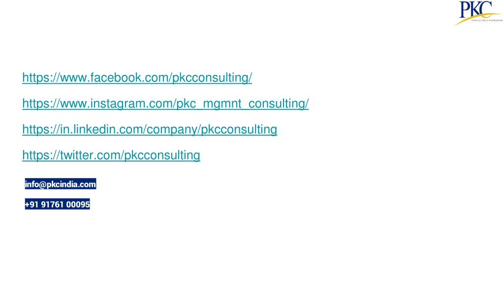 https://www.facebook.com/pkcconsulting/ https://www.instagram.com/pkc_mgmnt_consulting/ https://in.linkedin.com/company/pkcconsulting https://twitter.com/pkcconsulting info@pkcindia.com +91 91761 00095